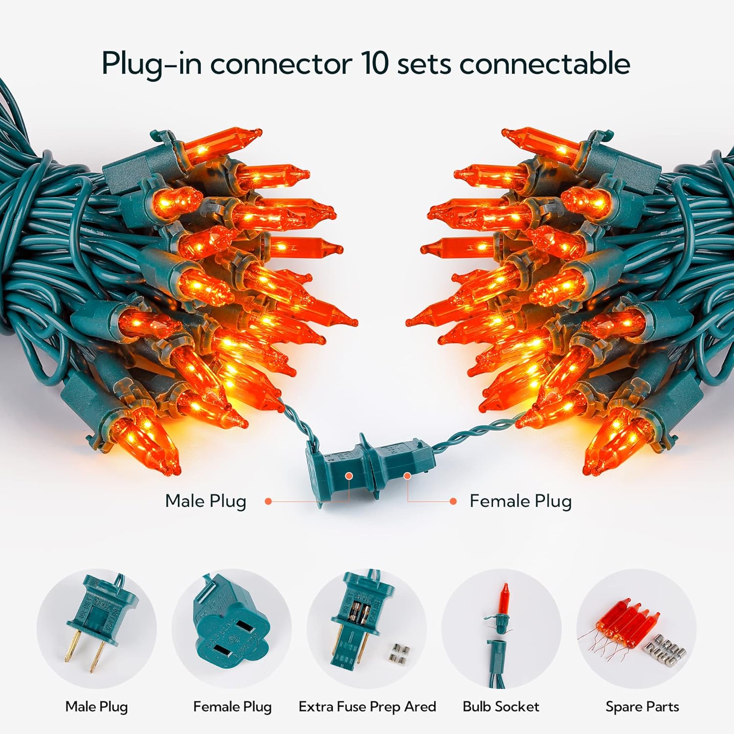- π50 Vibrant Lights with Perfect After Sale :Old-fashion orangen incandescent Halloween light set, creates a warm and festive atmosphere, surely lights up your house, let your home become a fantastic sight to behold in your neighborhood! With green wire, ideal for a tree, bedroom, patio decorations!If you have any reason you don't enjoy it, just send us a message and we will refund 100% or replace your purchase.