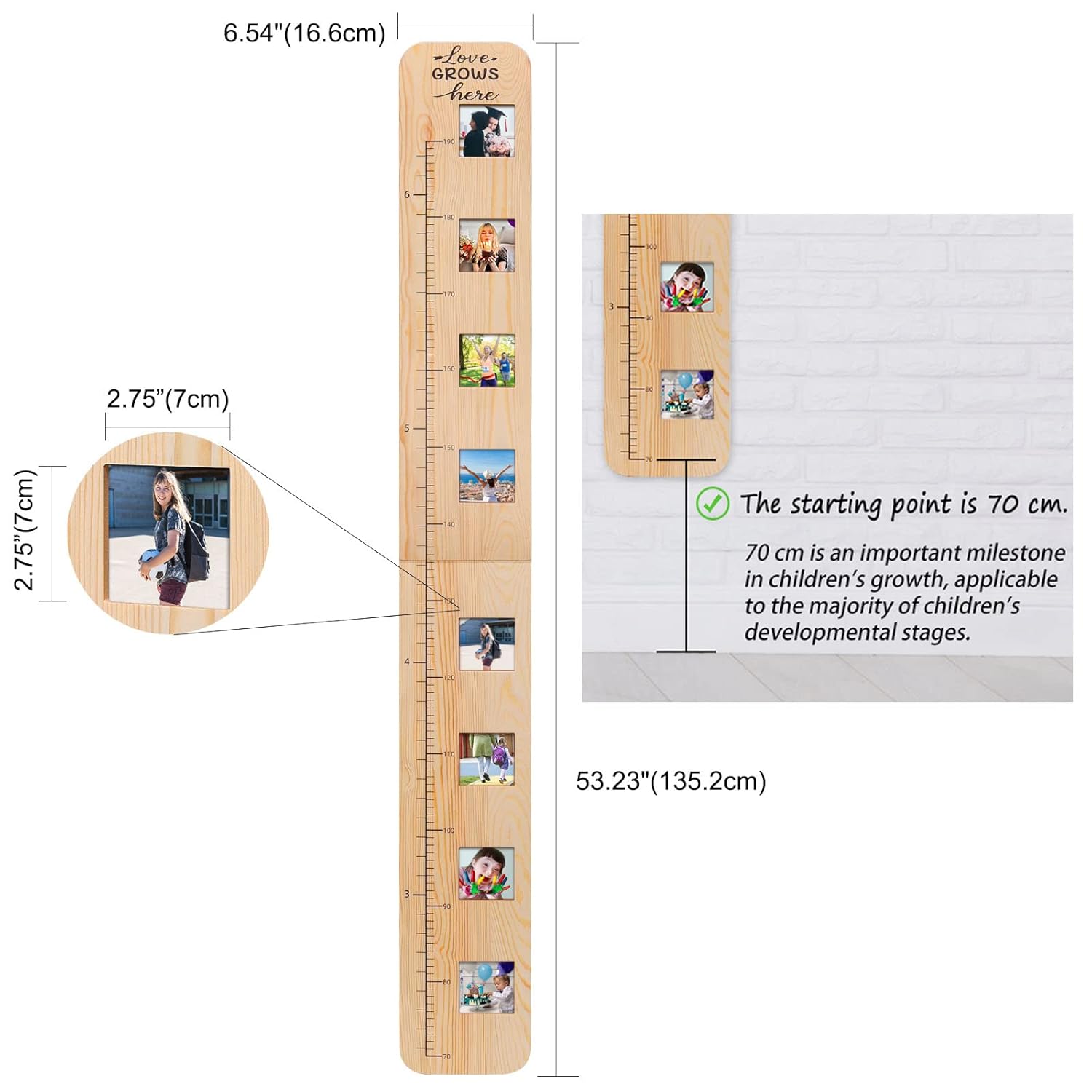 - Height Chart for Recording Kids Growth Mark: This height measurement for wall has 8 photo frames, each window freezes a moment of your child's growth and tells the story of your kids. Record the height and add the photo together with your child, creating your shared memories. It's like a book of your child's growth story, leaving a unique and eternal memory, symbolizing that your family's love grows deeper as your child grows