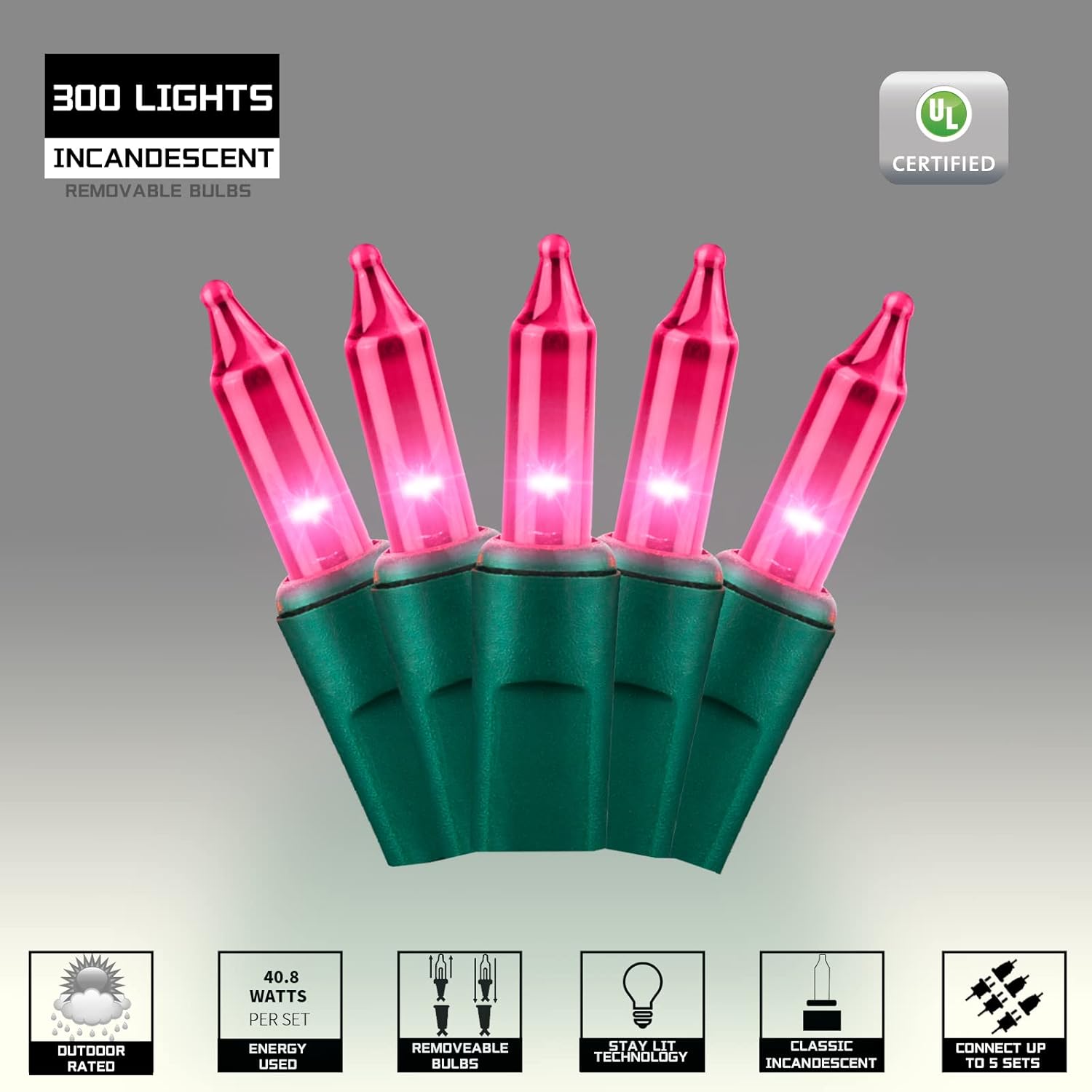 - Safty and Easily: High quality UL certified products ensure the safety of you and your family, Decorate with 300LIGHTS(2*150L) pink incandescent mini lights with green wire will give a soft festive feel to your Christmas.