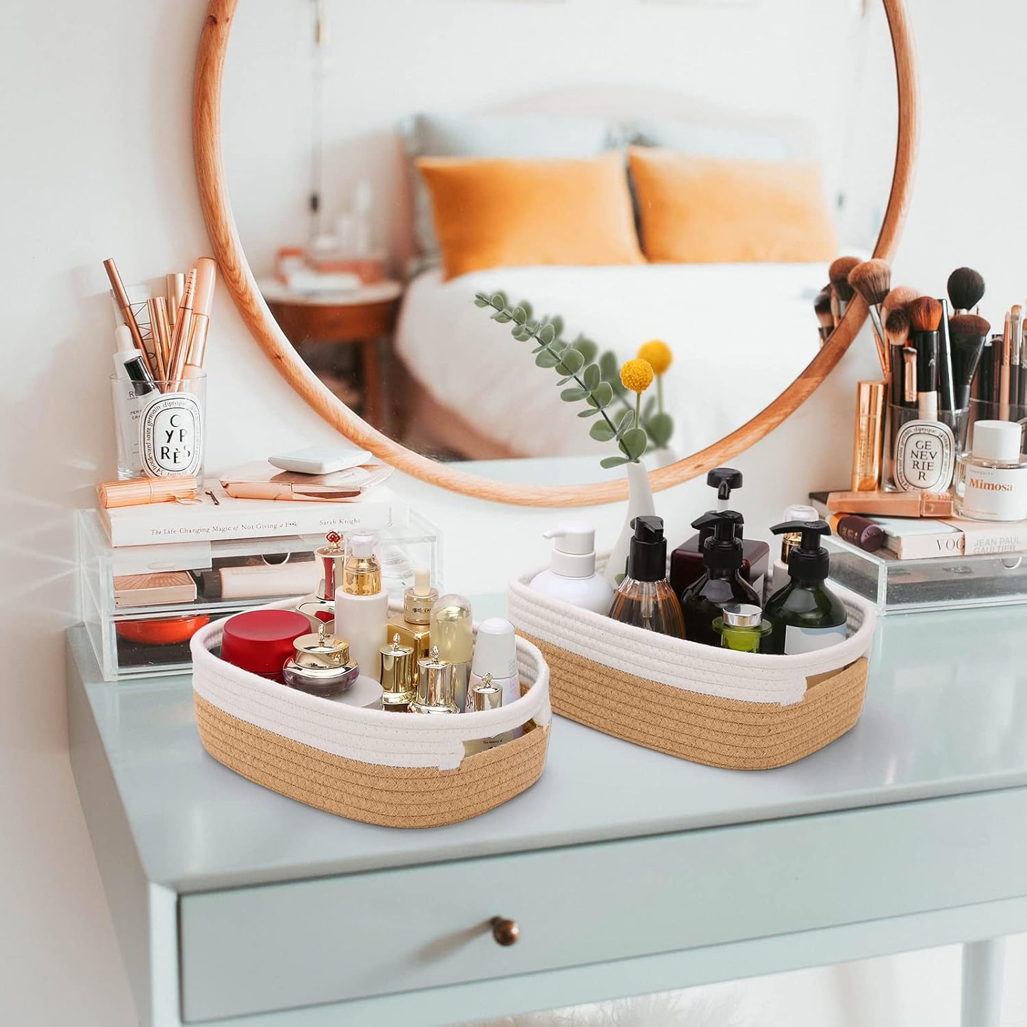 - High Capacity: This basket set comes with 2 practical small baskets to provide more storage space. Find the perfect place for all your messy supplies. This set of 7 fabric rope baskets can be used to organize blankets, towels, books, pet toys. The included small basket is perfect for storing keys, jewelry and accessories. Size: 11.8"x8.7"x4.3", 11"x7.9"x3.9", 10.2"x7.1"x3.5", 9.1"x6.3"x3.1", 7.9"x5.5"x2.8", 6.7"x4.7"2.4", 5.5"x3.9"x2.1"