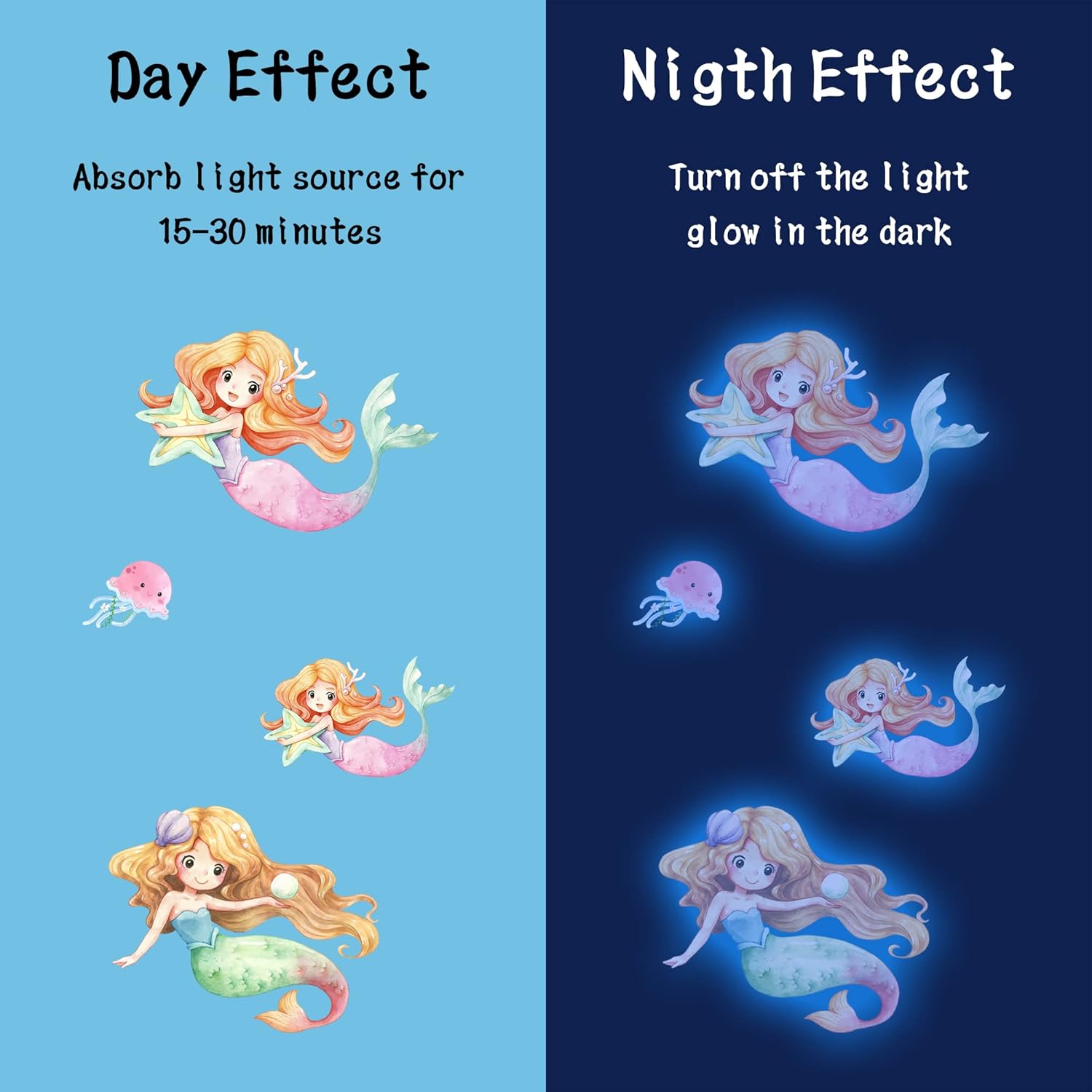 - 【Glow Bright and Long Time】- Our mermaid decals need to absorb light before they emit light. First you need to put them under sunlight,room light or flashlight for 15 to 30 minutes , then turn off the light, the sticker will emit a soft blue light without glare.Note:Please ensure the light shines unobstructed onto the decals.