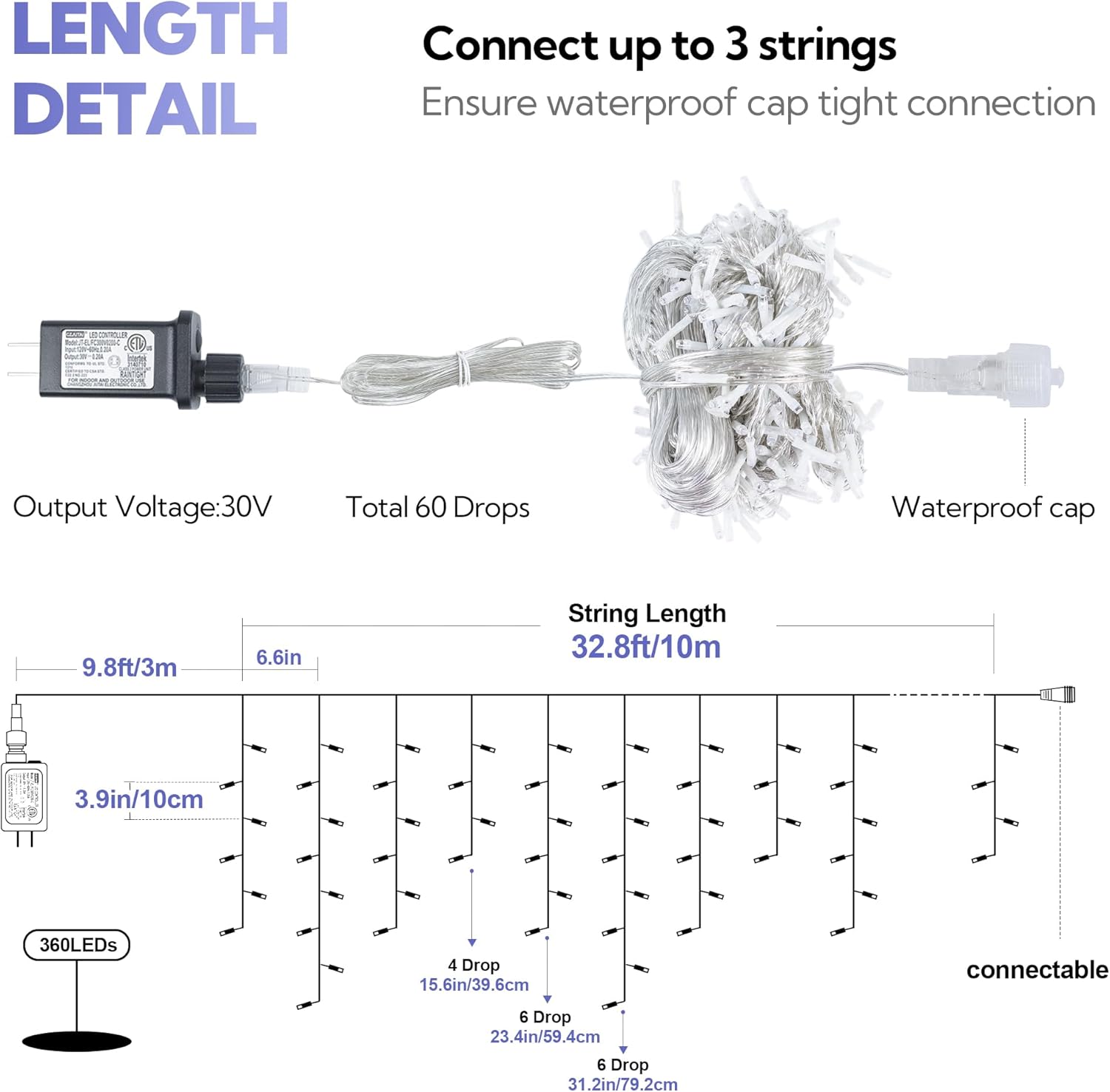 - 💗【Connectable for Wide Use】: Our icicle Christmas lights adopt 360L bright led bulbs,42.6ft/ 13m long in total with total 60 drops.Drop lengths 16''- 24''- 31''- 24'', number of light bulbs is 4, 6, 8, and 6 respectively. The outdoor string lights is extendable,can maximum connect with 3 sets.clear wire looks simple but dreamy.You can hang them on roof, hedge, fence, prom, patio, eave, handrail etc, creating romantic atmosphere for wedding,party,Valentine's Day,Christmas,New Year.