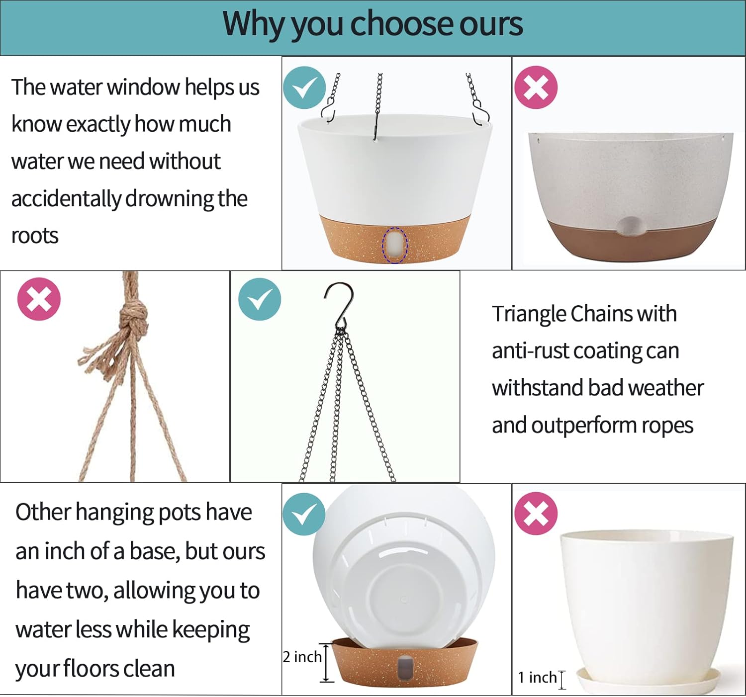 - With Hanging Chain and Hooks๏ผThe Chain is made of Stainless Steel and the Surface is plated with an anti-rust coating to further protect the chain from damage. Three Hooks design can increase the stability of the hanging planters. It can withstand inclement weather when used on outdoor plants.