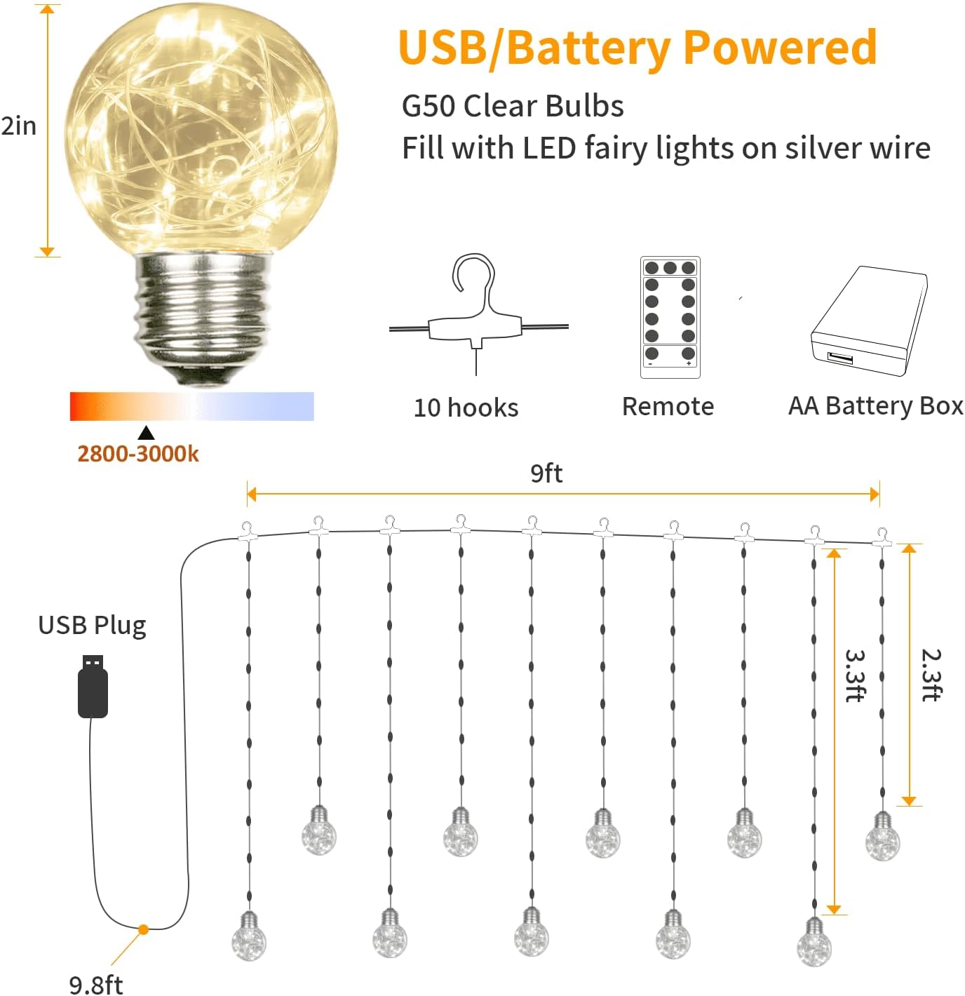- Dual Power Options: The wishing ball lights feature 5V low voltage operation. It features a 9.8ft USB plug cord to reach the USB device, and a AA battery box for battery power if there's no outlet nearby. It's easy and portable to illuminate the curtain lights. (AA batteries are not included)