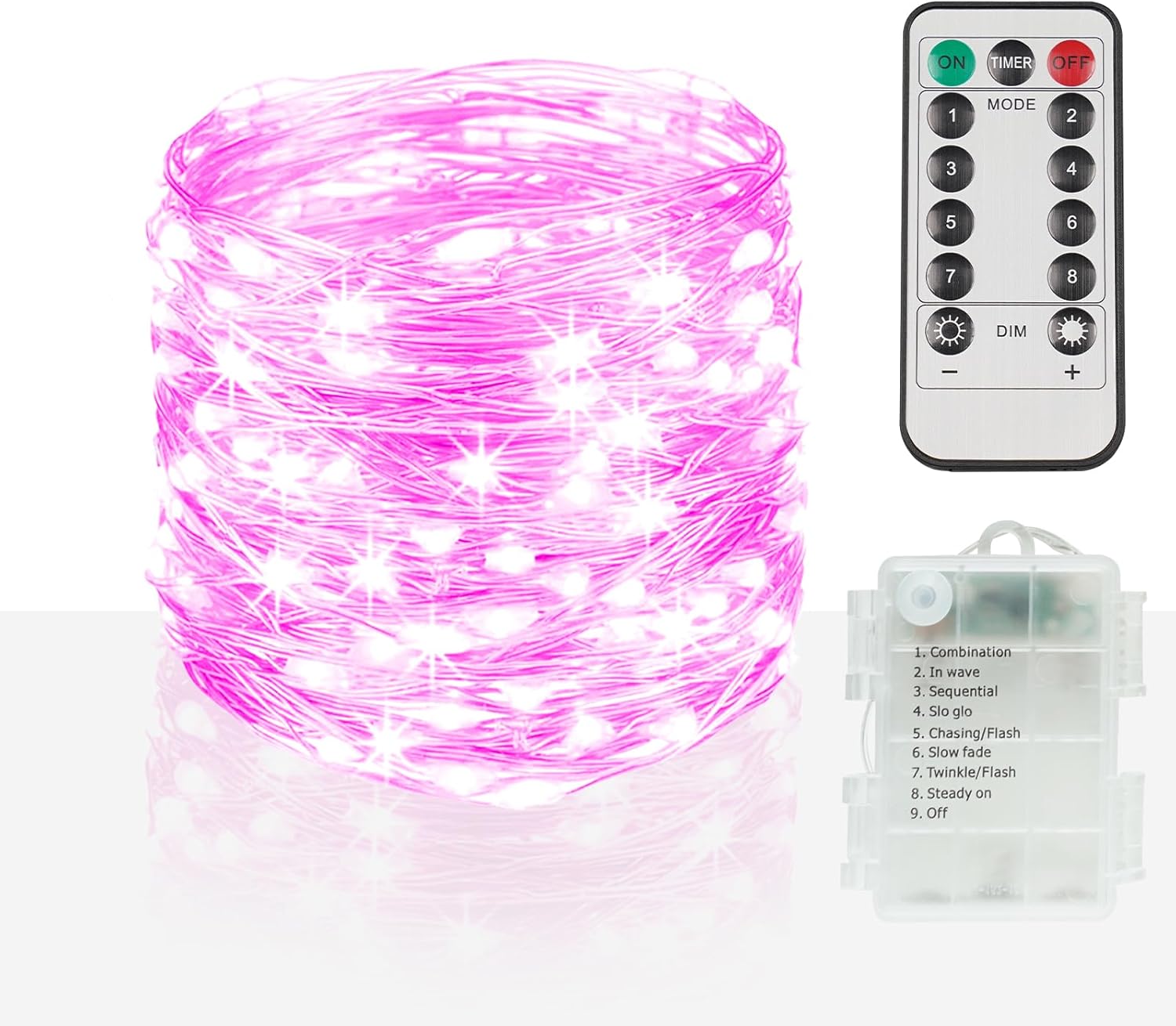 - 💗REMOTE CONTROL FAIRY LIGHTS: This multifunctional pink Christmas string light is super convenient, and enables us to switch eight flashing modes, and adjust the brightness quickly. Additionally, the timer function allows us to set up on/off time for 6hrs on/ 18hrs off. The twinkle lights will turn on automatically by settings, helping us to create a magic light show in the future.