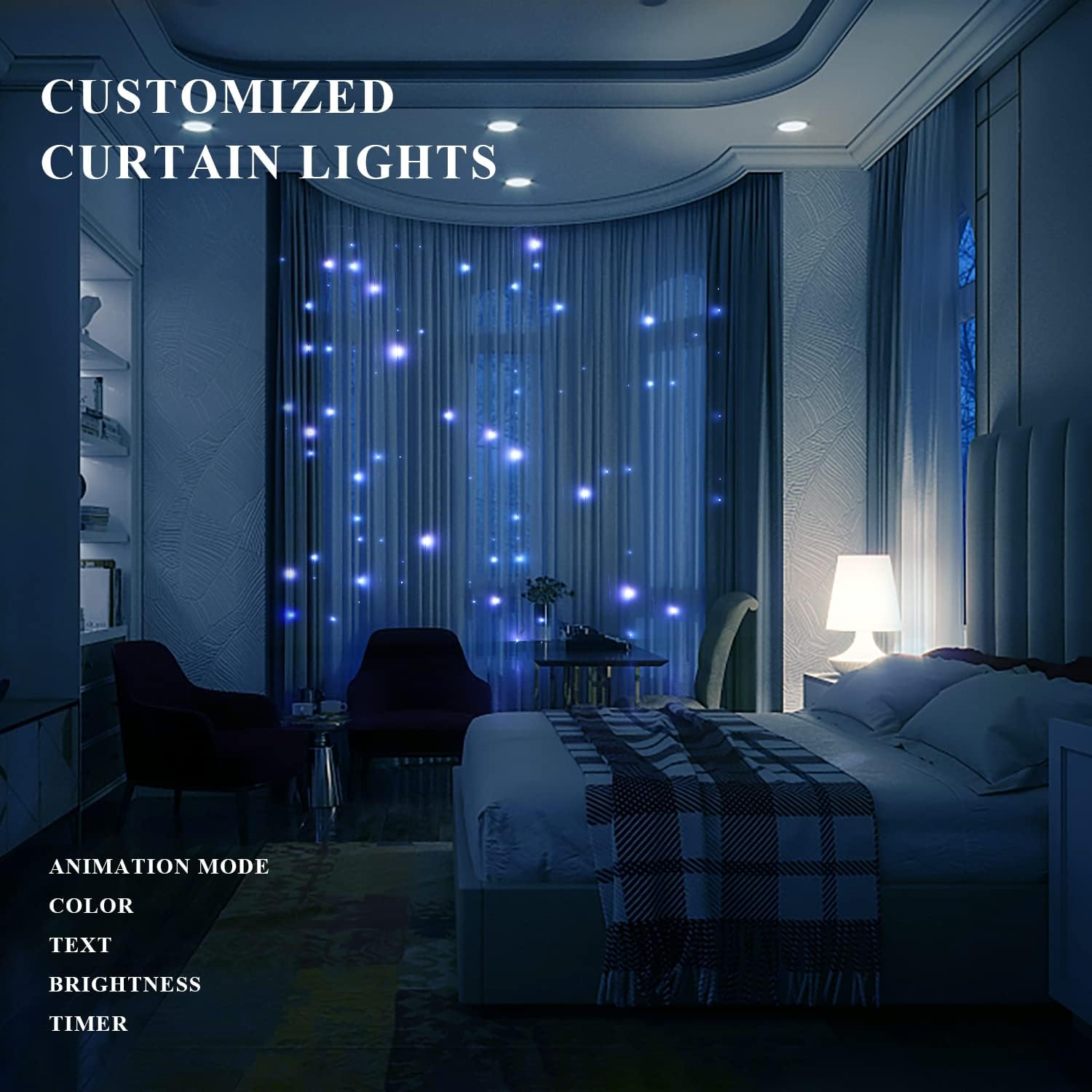 - Multiple light modes and DIY function- The lights have multiple animation options, including pumpkins, skulls, Santa Claus, Deer, Maple Leaf, the American flag, Meteor showers, snows, hearts, and other animations. It can be both daily and festival decorations. There are 12 fixed color and RGB color selection areas on the APP, you can choose colors, draw, or enter text to meet your needs of personalizing and customizing, creating unlimited ideas in the color-changing curtain lights.