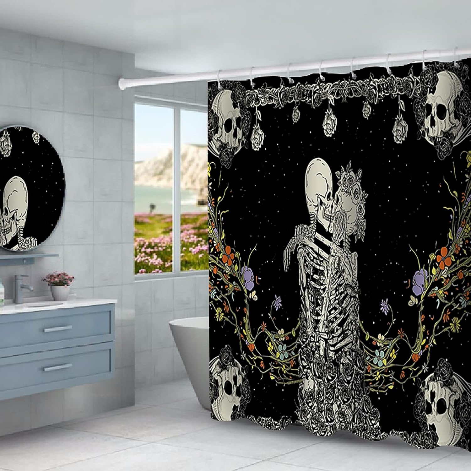 - 🛀【Halloween Bathroom Accessory Set/ Sets】Halloween skull couple with flower shower curtains sets included :1 PC fabric waterproof shower curtain; 1PC Rectangle Bath rugs; 1 PC U-shaped Contour Mats; 1 PC Toilet Lid Cover; 12 PCS/C-shaped White Plastic Hooks. No liner is needed