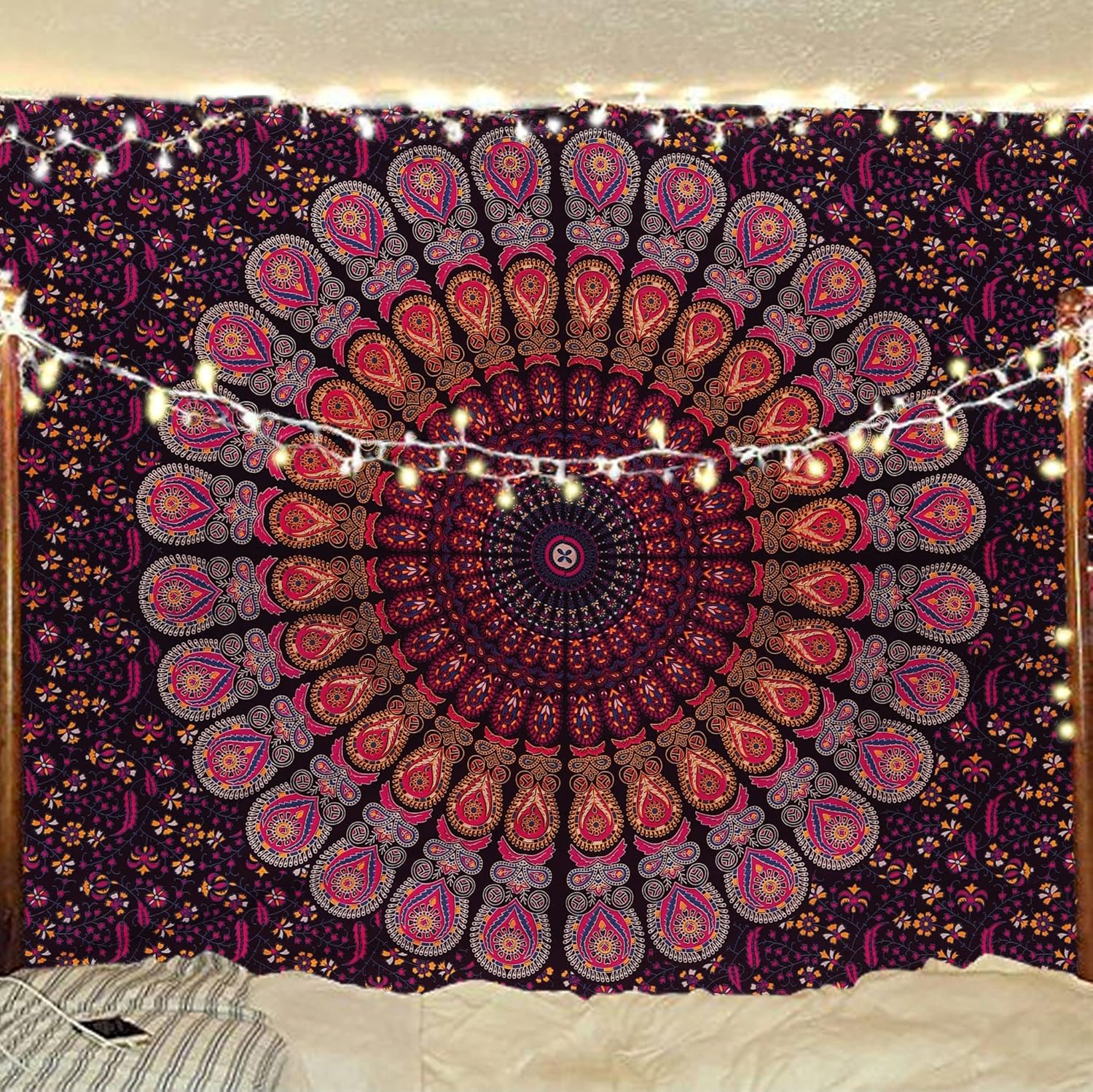 Bless International Handmade Indian hippie Bohemian Psychedelic Peacock Mandala Wall hanging College Dorm Beach Throws Table Cloth Bedding Tapestry (Golden Pink Blue, Medium(54x60Inches)(137x152cms))