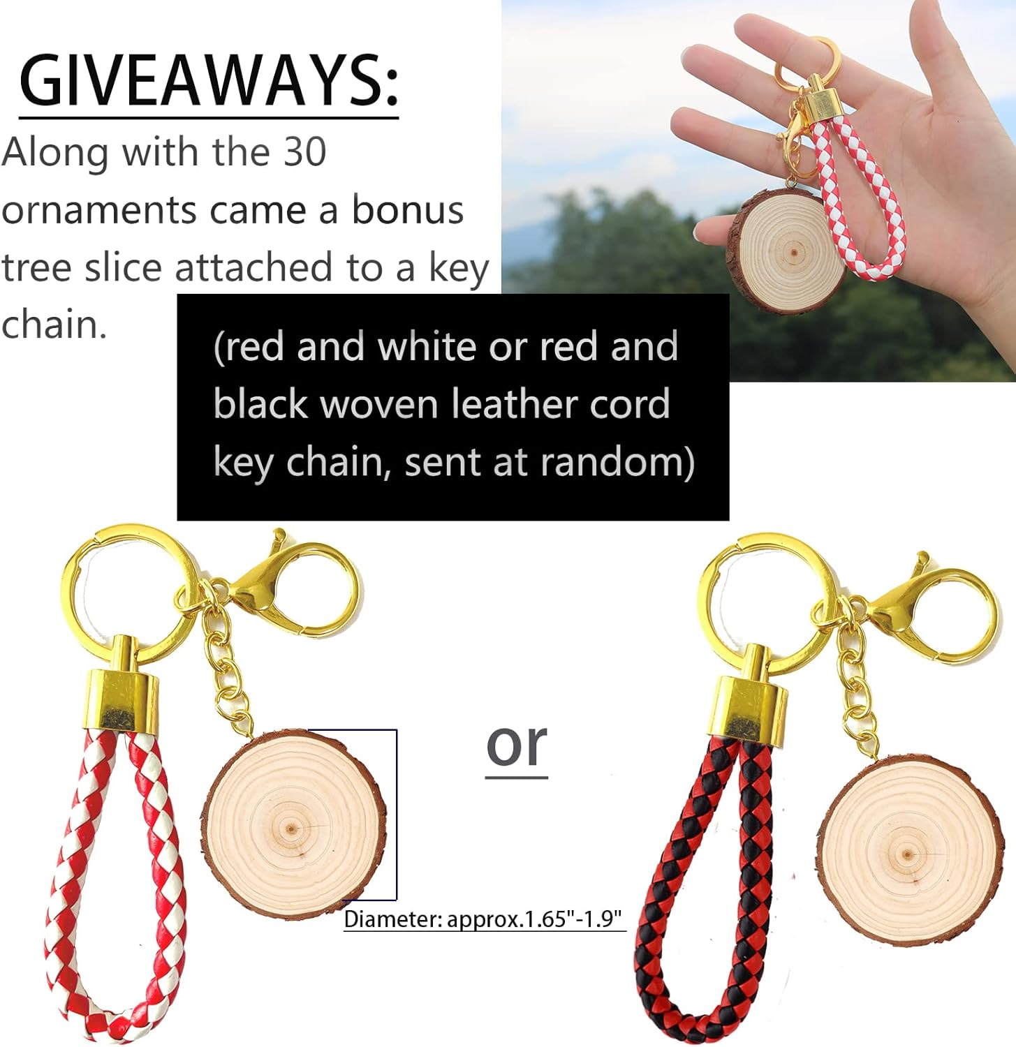- Package Includes: + 30 Pcs wood craft slice set . Each wood slice was predrilled with a hole , Diameter: approx. 3.5"-4.0" / Thickness: approx. 0.4". + One roll jute twine and one roll of red and white cotton rope,33 feet each. + One bonus tree slice attached to a key chain ,(Red and white or red and black woven leather cord keychain, sent at random).