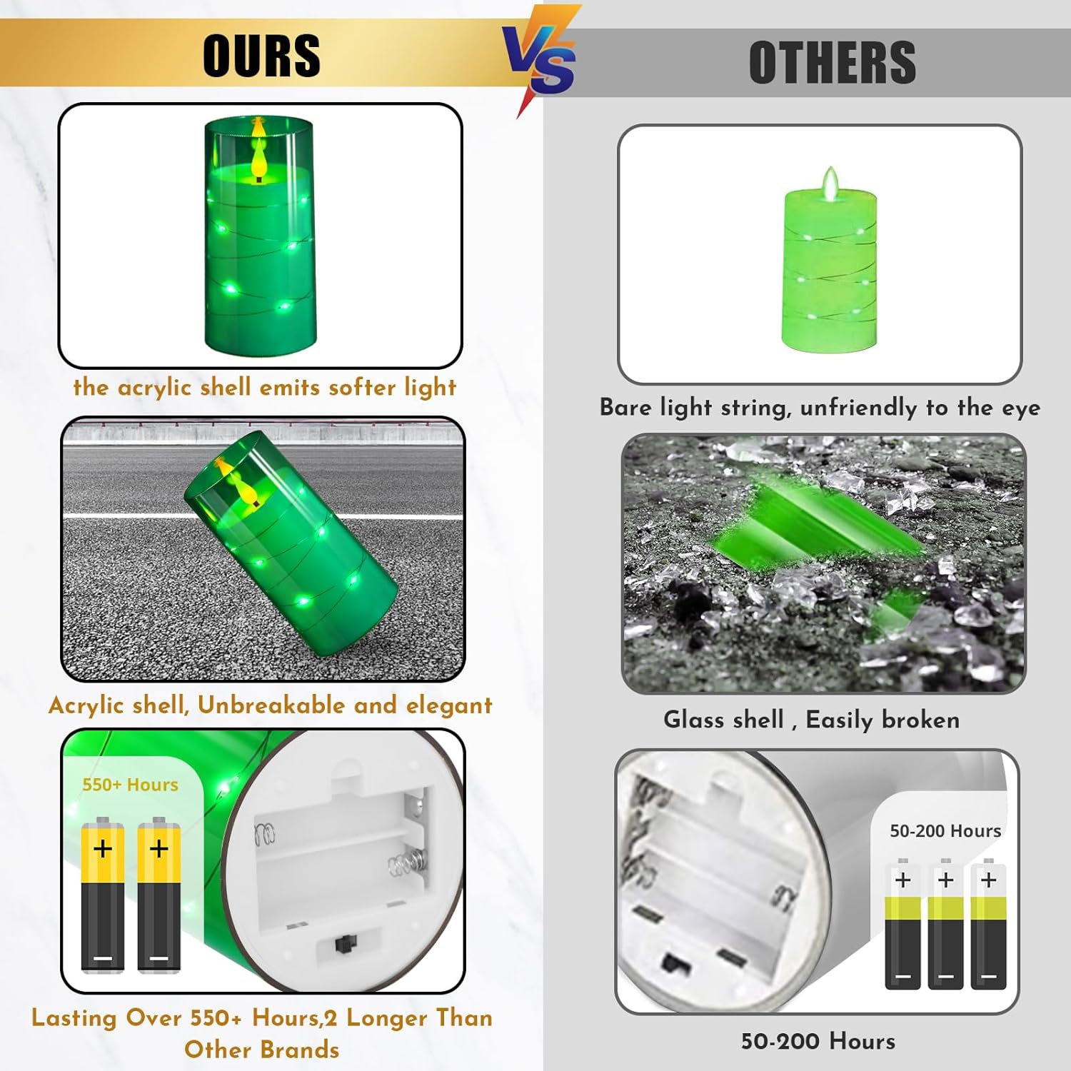 NURADA Flickering Flameless Candles: Built-in Star String Acrylic Battery Operated LED Pillar Candles with Remote and Timer for Home Party Weddings Christmas Halloween Decor -Green 3 Pack