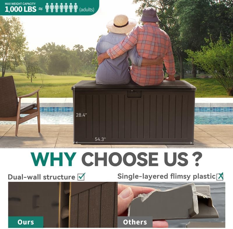 - IMMENSE STORAGE CAPACITY:This XL-sized outdoor storage box features a generous 150 gallon capacity; With dimensions of 54.3"L x 27.2"W x 28.4"H, the deck box offers ample space to accommodate both indoor and outdoor storage, great for cushions, tools, etc