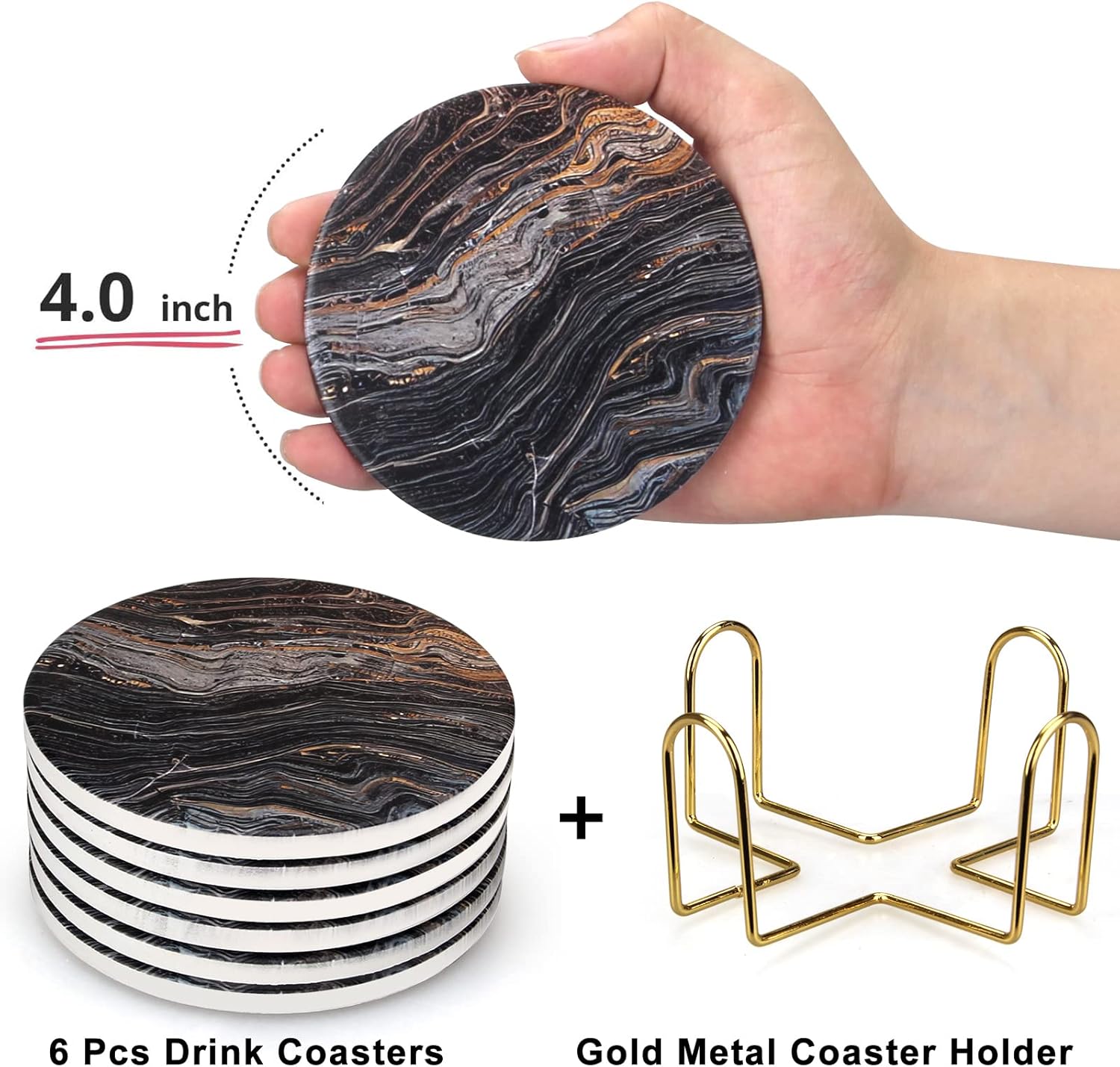 - Coaster with Metal Holder Set: 6 pcs 4" Round ceramic coasters and a 4.5" gold metal coaster holder.