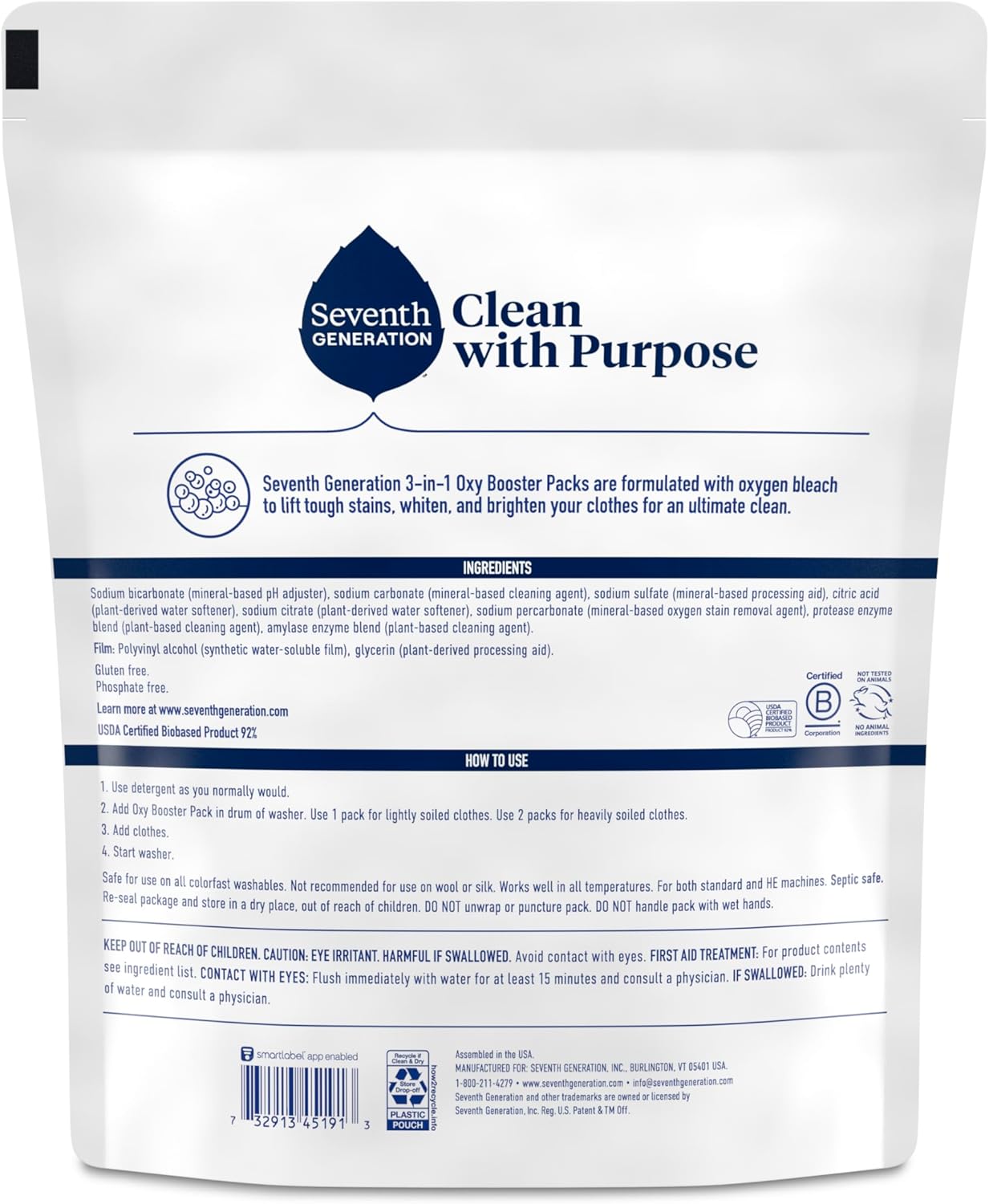 - One Oxy Booster pack per load for lightly soiled clothes, used with Seventh Generation laundry detergent, keeps clothes looking great. Use two packs for heavily soiled clothes.