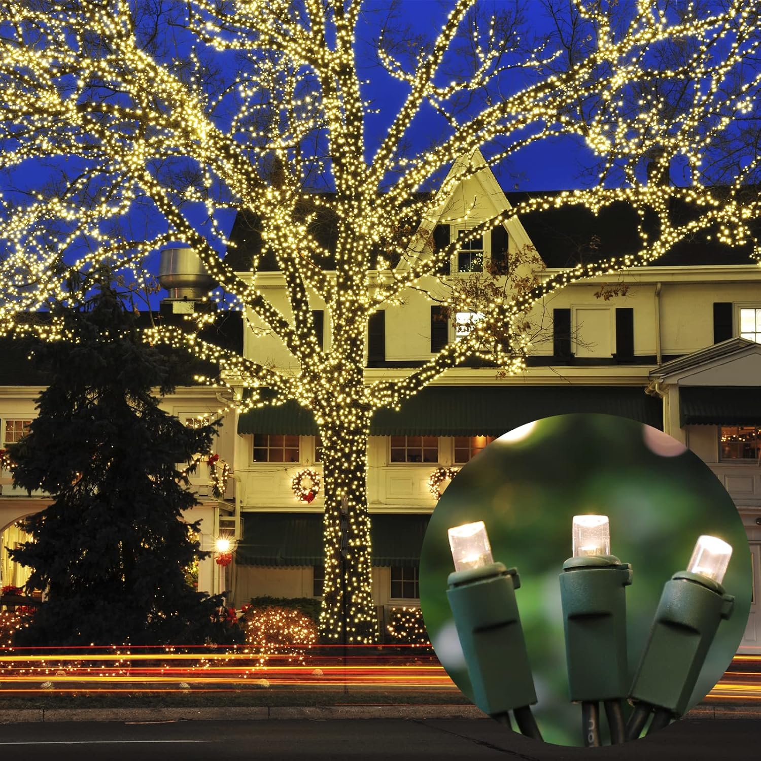 - Safe to use: Just plug or unplug to turn the light on or off. There is a fuse inside the plug to protect the lamp from burning out. UL588 safety certification, you can rest assured to use, very safe.The little bulbs in green wire color create a 360-degree flash that's super bright and festive, brightening up your holiday with warm sunlight and enough brightness.