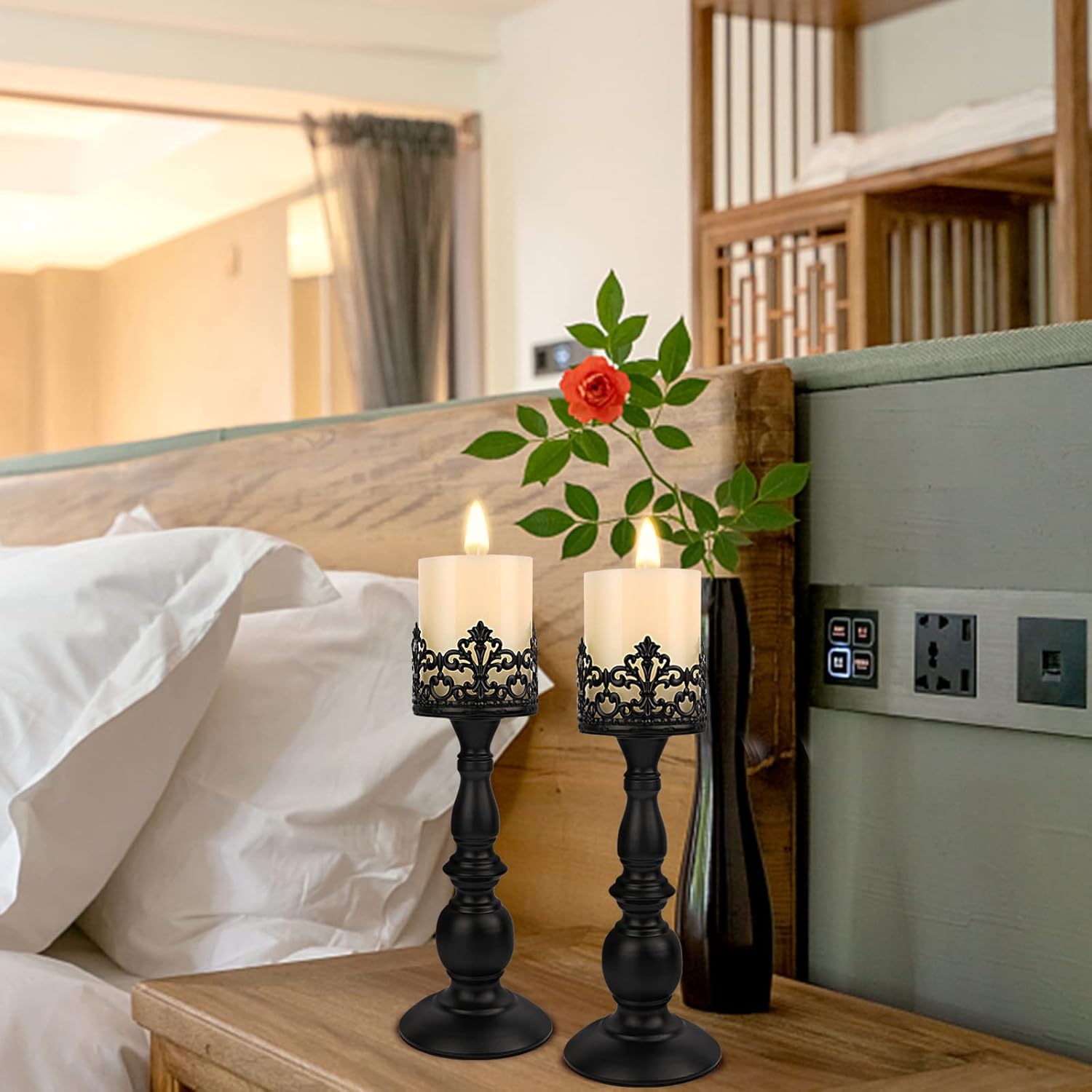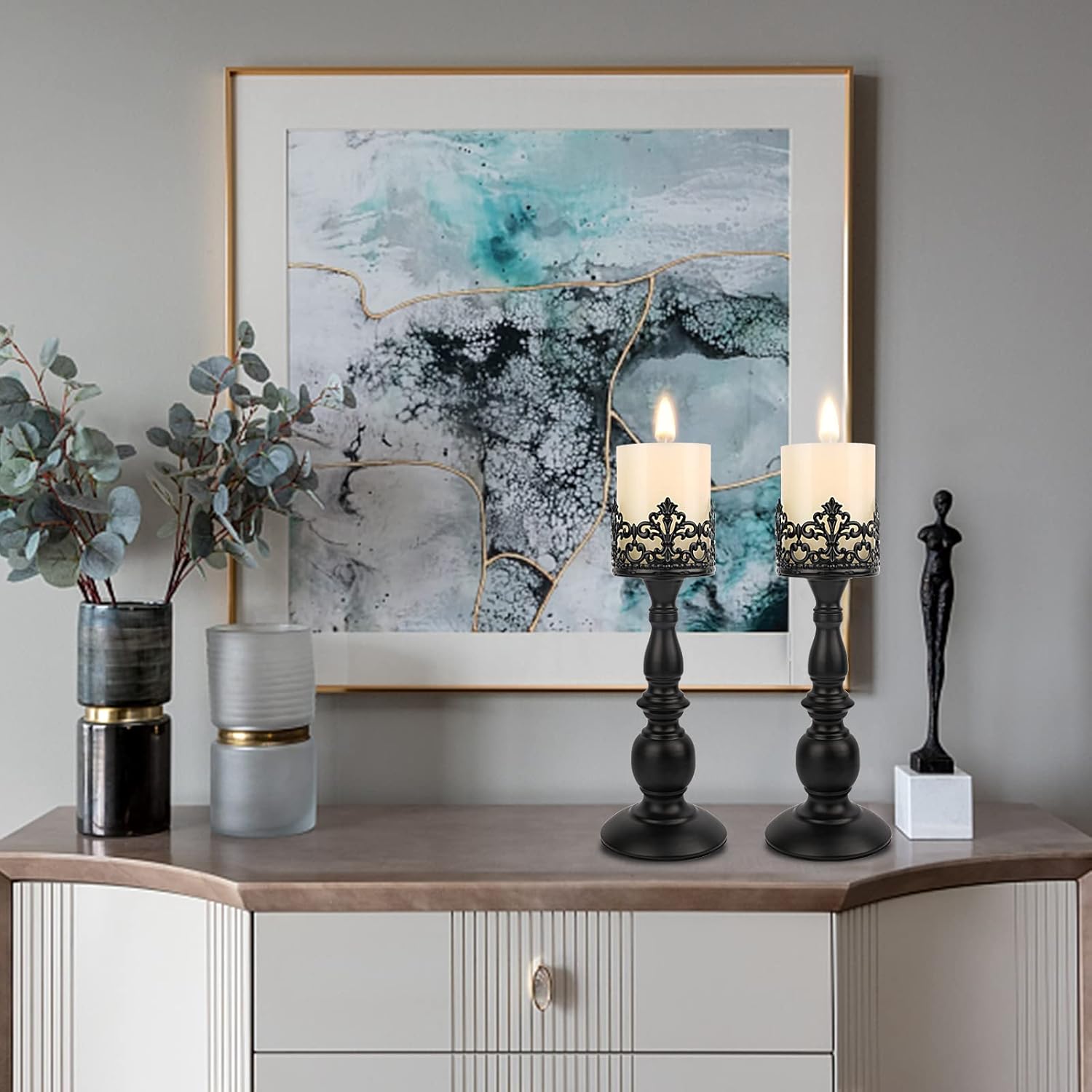 - INCLUDING: 2x black candle holders(Candles not included). Candle holders height:11inch (28cm) bottom diameter: 4.1inch (10.4cm).All candle plate diameter are 3.15''(8cm). Check if your candle size is suitable before purchasing. Additionally, it also includes an installation manual, and the candle holders require simple self-assembly.