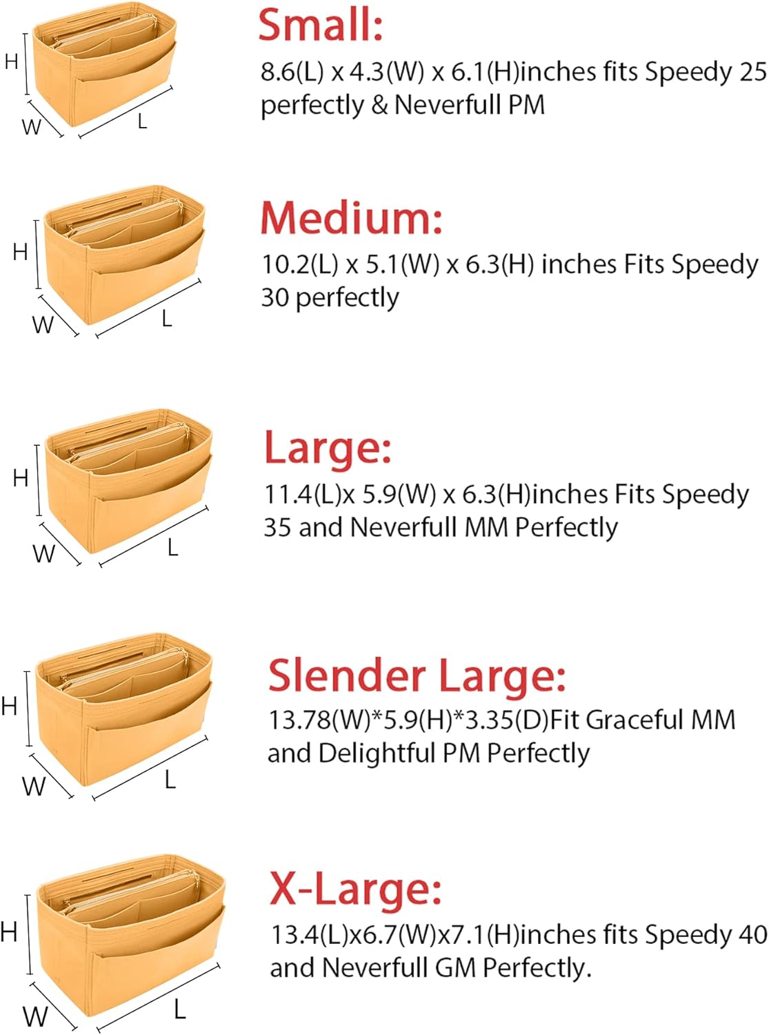 - SIZE OF BAG ORGANIZER: Medium: 9.25(L)*5.9(H)*5.1(W) inch Fits Speedy 30 Perfectly. Slender Medium: 11.2(L)*6.5(H)*3.2(W)inch Fits Graceful PM. Large: 11.4(L)*7.1(H) *5.9(W)inch Fits Speedy 35 and Neverfull MM Perfectly. Slender Large: 13.78(L)*5.9(H)*3.35(W)Fit Graceful MM and Delightful PM Perfectly. X-Large:13.4(L)*7.1(H)*6.7(W)inch fits Speedy 40 and Neverfull GM Perfectly. Portable and Compact Purse Perfectly For any Brand.L*H*W means (Length*Height*Width)