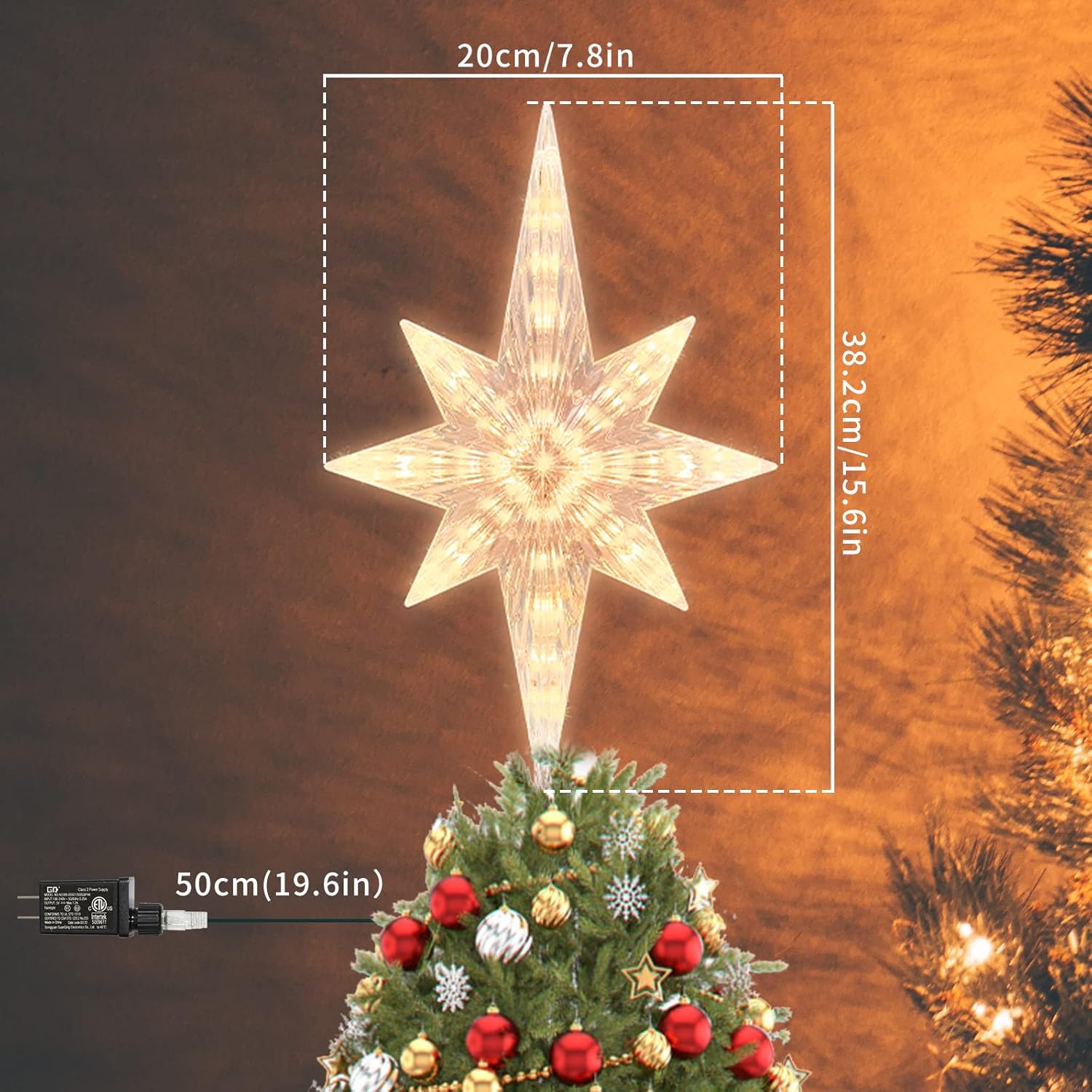 - This tree Bethlehem Star topper is 110V pulg in WORKING. This Bethlehem Star tree topper measures about 15.6 inch from top to bottom and 7.8 inch across, which is suitable for general size Christmas tree.
