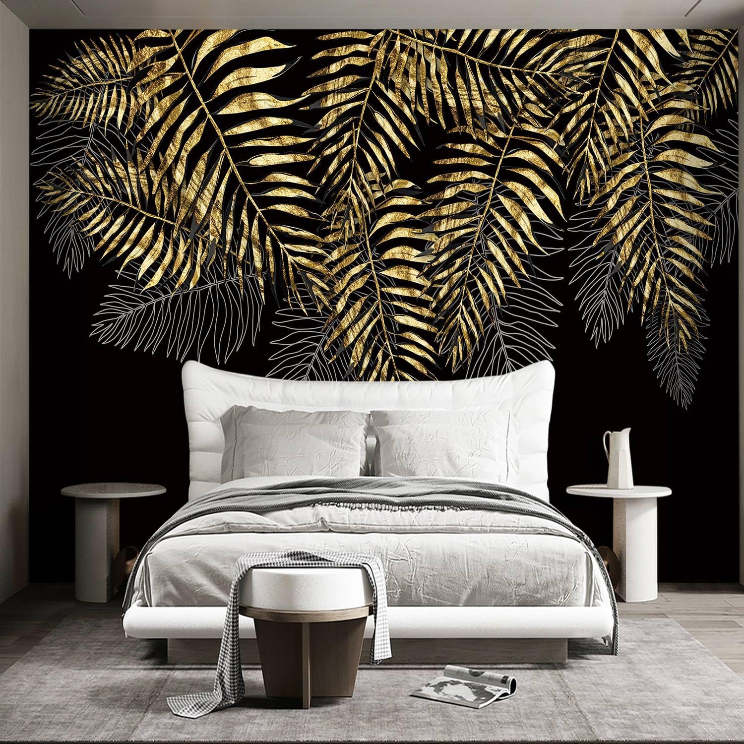 Black and Gold Leaf Mural Bedroom Tropical Botanical Wallpaper Room Plant Decor Living Room tv Background Large Wall Mural - 160"x108" (Not Peel and Stick)