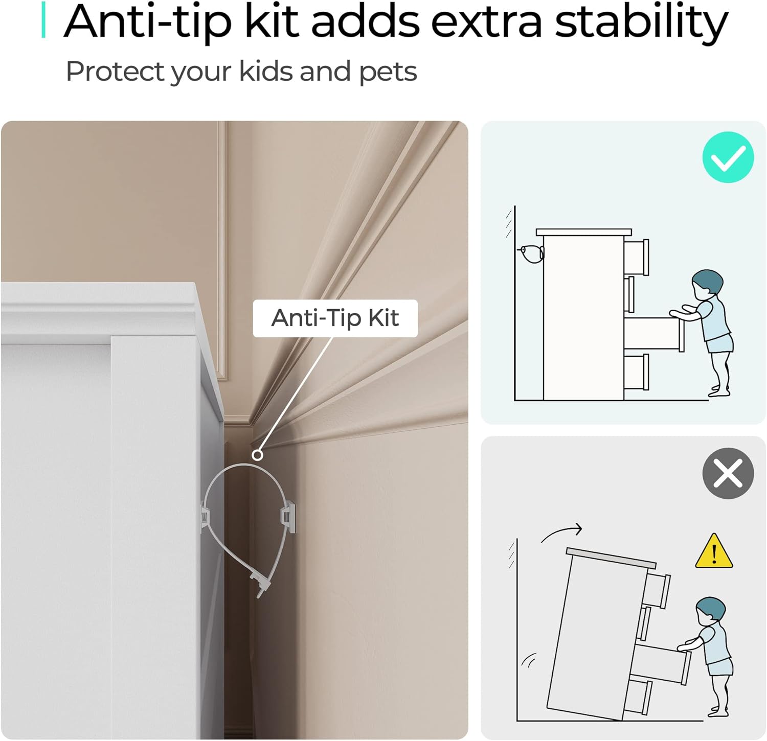 - [SAFETY FIRST] - Wall anchor kit provided to prevent tip-over incidents. Smooth metal runners on each drawer with safety stops prevent drawers from puling out.