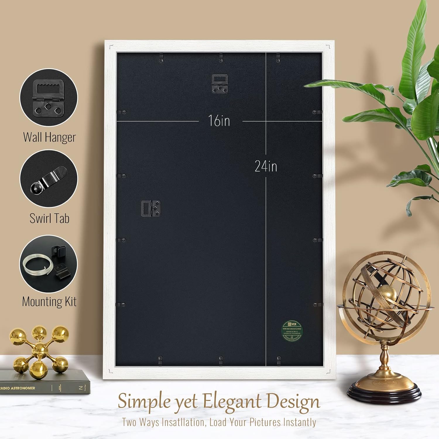 - PRODUCT FEATURES: The overall size is 25.8βx17.8β for Pictures 16x24 or 24x16, horizontal/vertical for table or wall display. Unlike others, special swirl tabs make the frame super easy to load pictures.