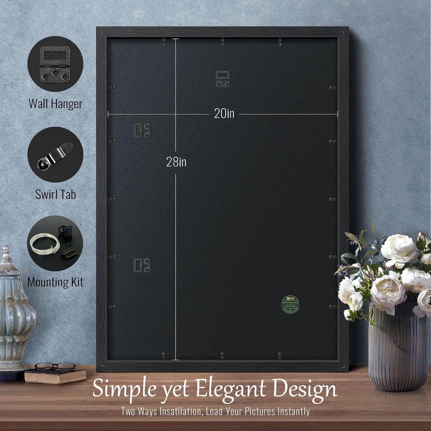 - PRODUCT FEATURES: The overall size is 29.8βx21.8β for Pictures 20x28 or 28x20, horizontal/vertical for table or wall display. Unlike others, special swirl tabs make the frame super easy to load pictures.