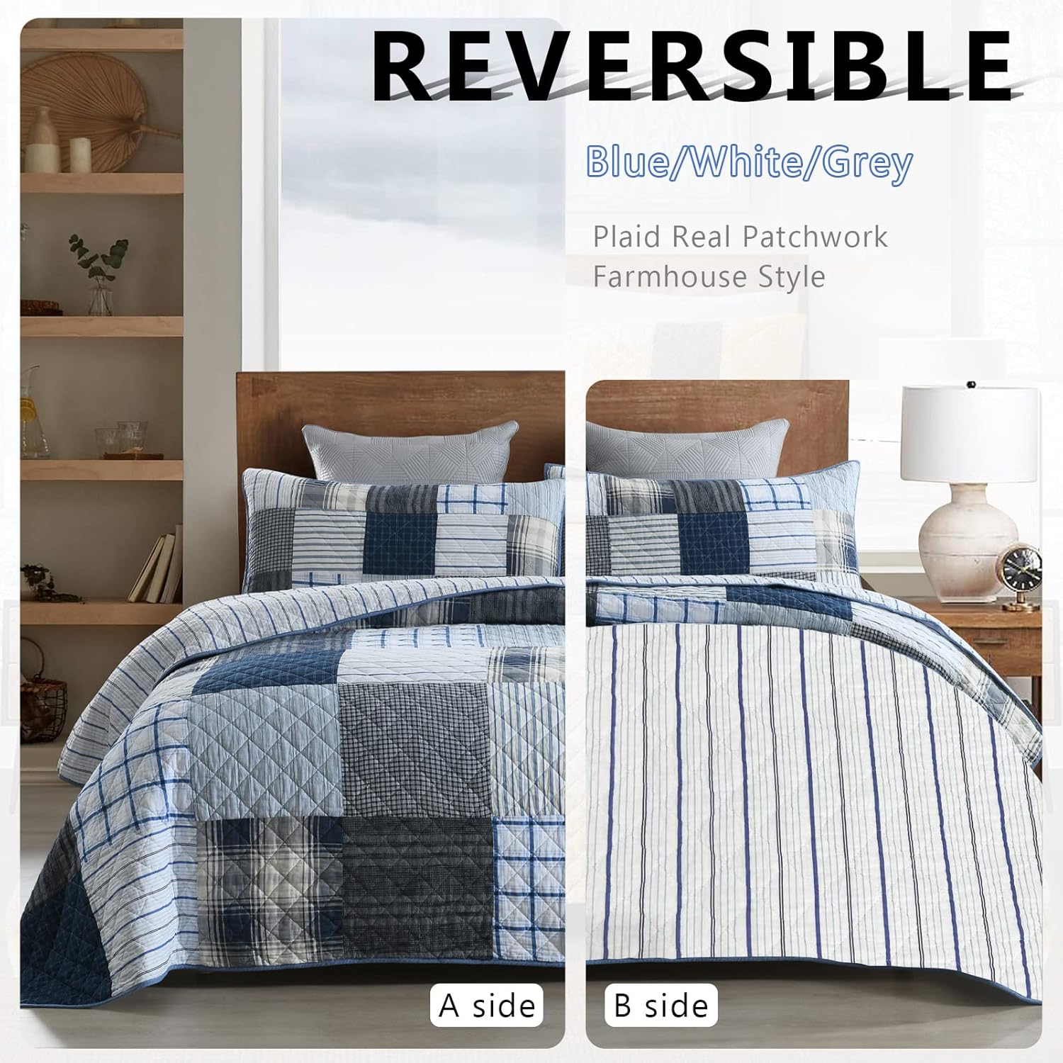 - UNIQUE DESIGN: The queen real patchwork quilt set is made of different patterns pieces sewn together. It is reversible. Its A side is designed with grid patchwork and its B side with classic strips. The modern and special design fits for any home decoration brightening your room. It is the best gift choice for your families and friends.