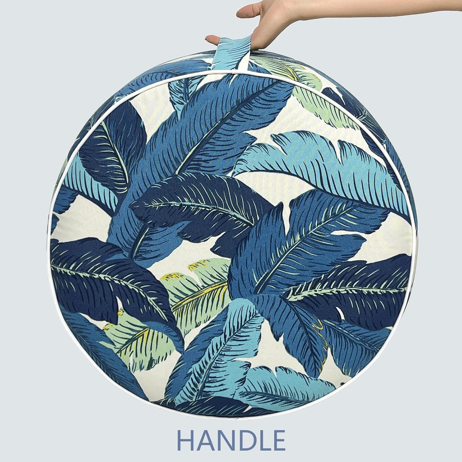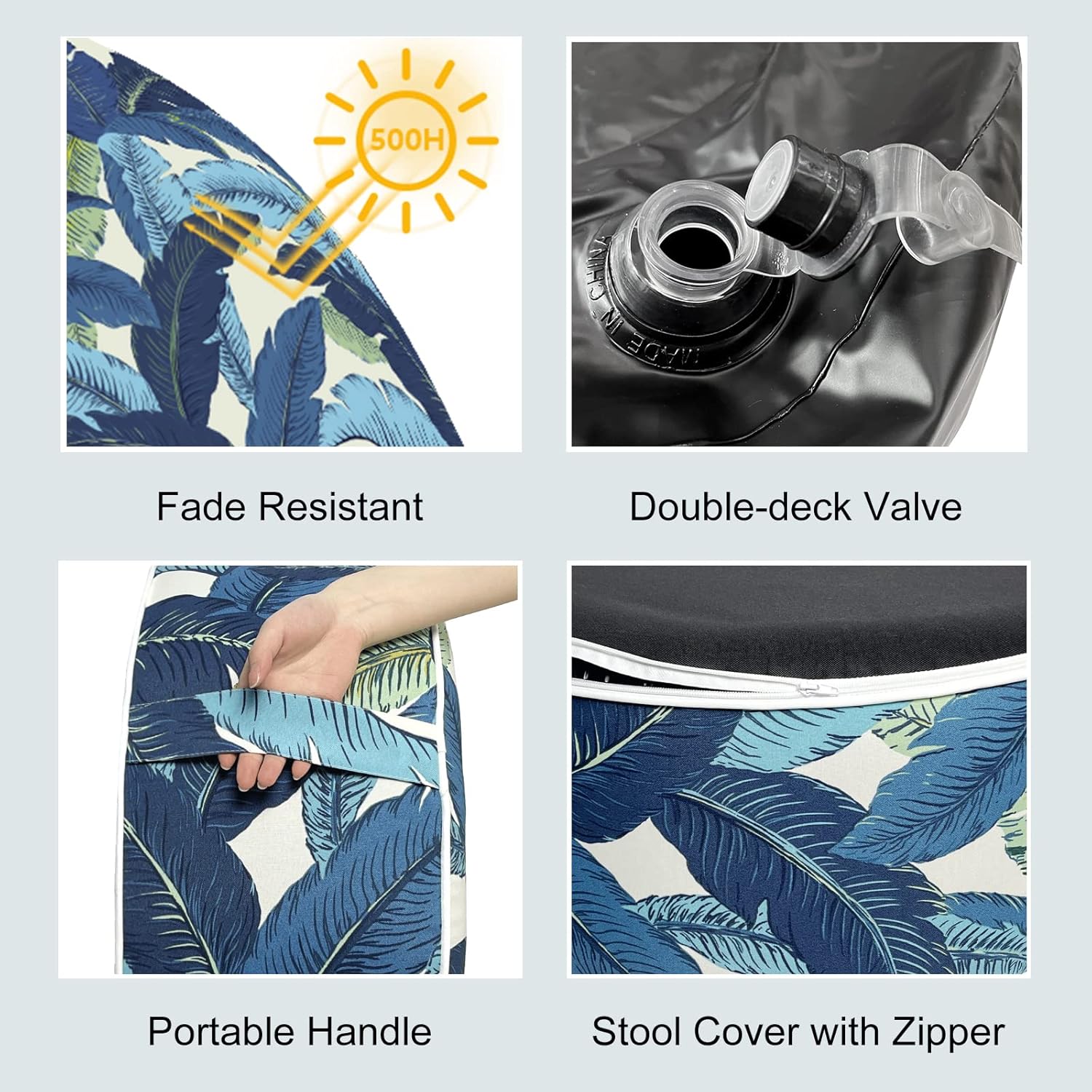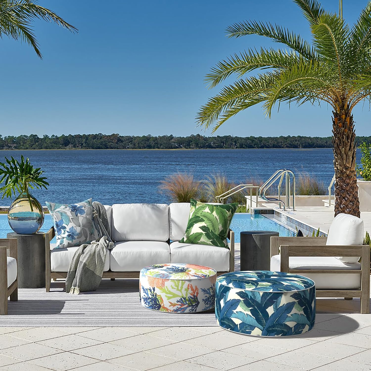 LVTXIII Indoor/Outdoor Inflatable Ottoman, D31 x H14 Inch Large Round Ottoman, All Weather Foot Rest Stool, Portable Footrest for Patio, Garden, Camping and Home - Swaying Palms Blue
