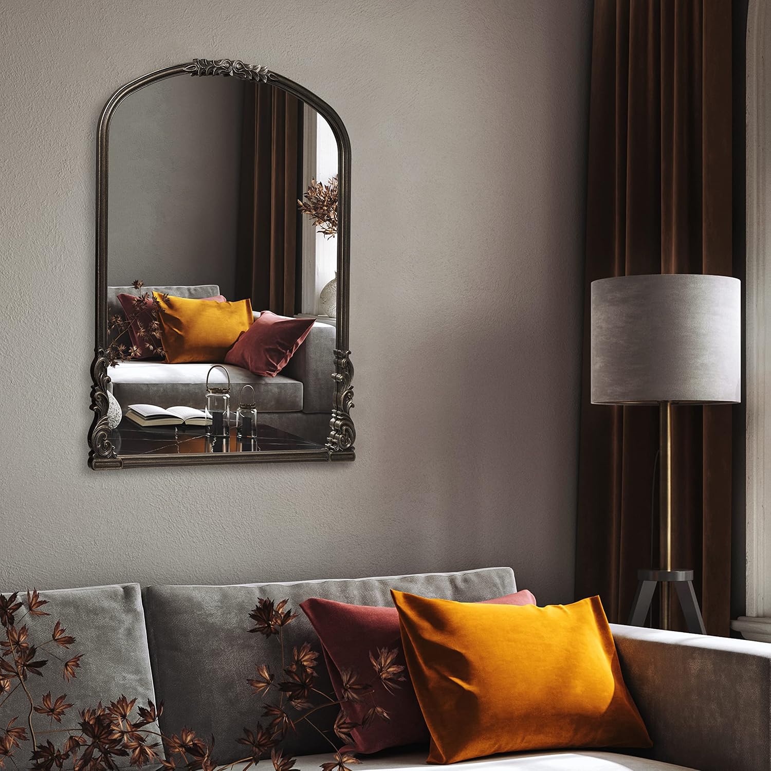 English Estate Carved Arch Wood Wall Mirror, Mirror for Entryway, Living Room, Bathroom, Antique Black, 28.4x35