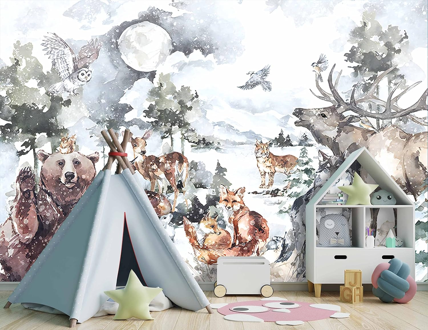 Boys or Girls Cartoon Watercolor Animals wallpeper Nursery Kids Bedroom Wall Mural - 160"x108"(Not Peel and Stick)