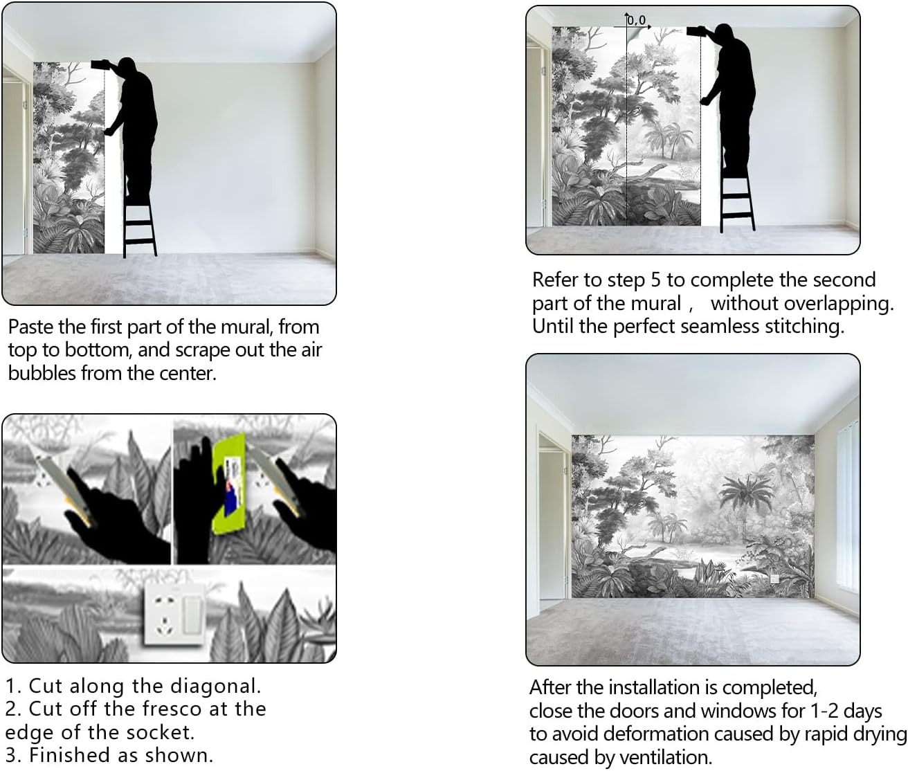 - It's easy to install: at the bottom of each mural we have a numbered sequence, You can refer to the instructions we provided and the main picture 6-7,just match the numbers and you'll be amazed!