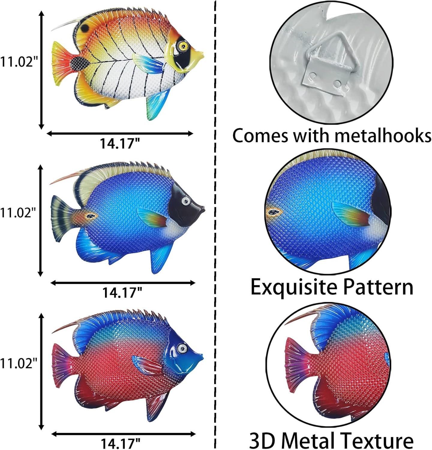 - Product Details - You will get 3 piece fish decoration - Measures 14 x 10 inches. The vivid metal wall decor matches is perfect for any decor style and can be displayed in bedroom, living room, office, study, baby room, kitchen, yard, porch, patio, garden and more