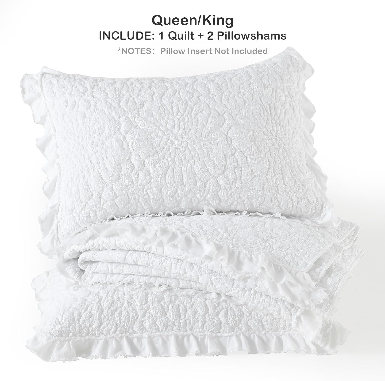 HORIMOTE HOME White Ruffled Quilt Queen Size, Stone-Washed Microfiber Lightweight Crinkled Farmhouse Rustic Shabby Chic Bedding Set, 3 Pieces Reversible Bedspread with Pillow Shams for All Season