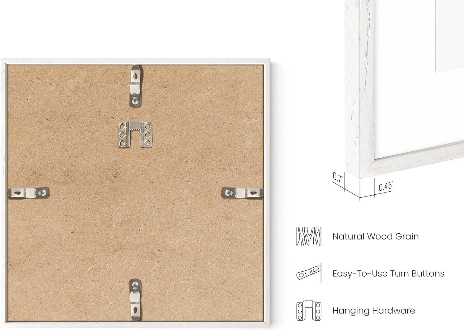 - POSTER FRAME WHITE WOOD FRAMES: The white frames gallery wall frames showcase the detail of the oak wood, with its unique grain patterns and rich hues. Our square frames with mat will enhance your photographs and artwork, while the durable construction ensures your memories are exhibited for years to come. Embrace the seamless blend of natural materials and contemporary design with our large wood picture frame sets for wall, bringing a touch of modernity to your cherished moments