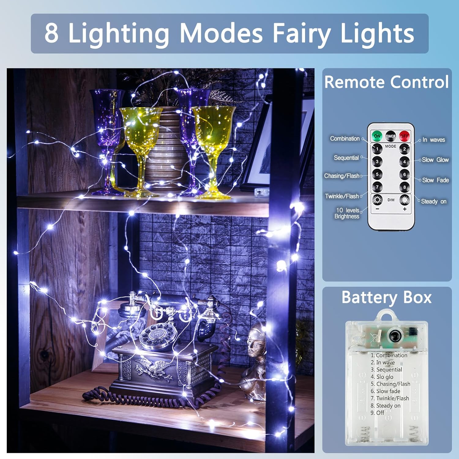 - Cool White Lights Battery Operated: Made with ultra-bright LED and durable silver-coated copper wire and battery box, the fairy lights will be an ideal choice for your home decor. Each set contains 4pcs of string lights and 2pcs of remote controls. Each String light length is 26ft with 80 LED (AA battery case, batteries not included.)
