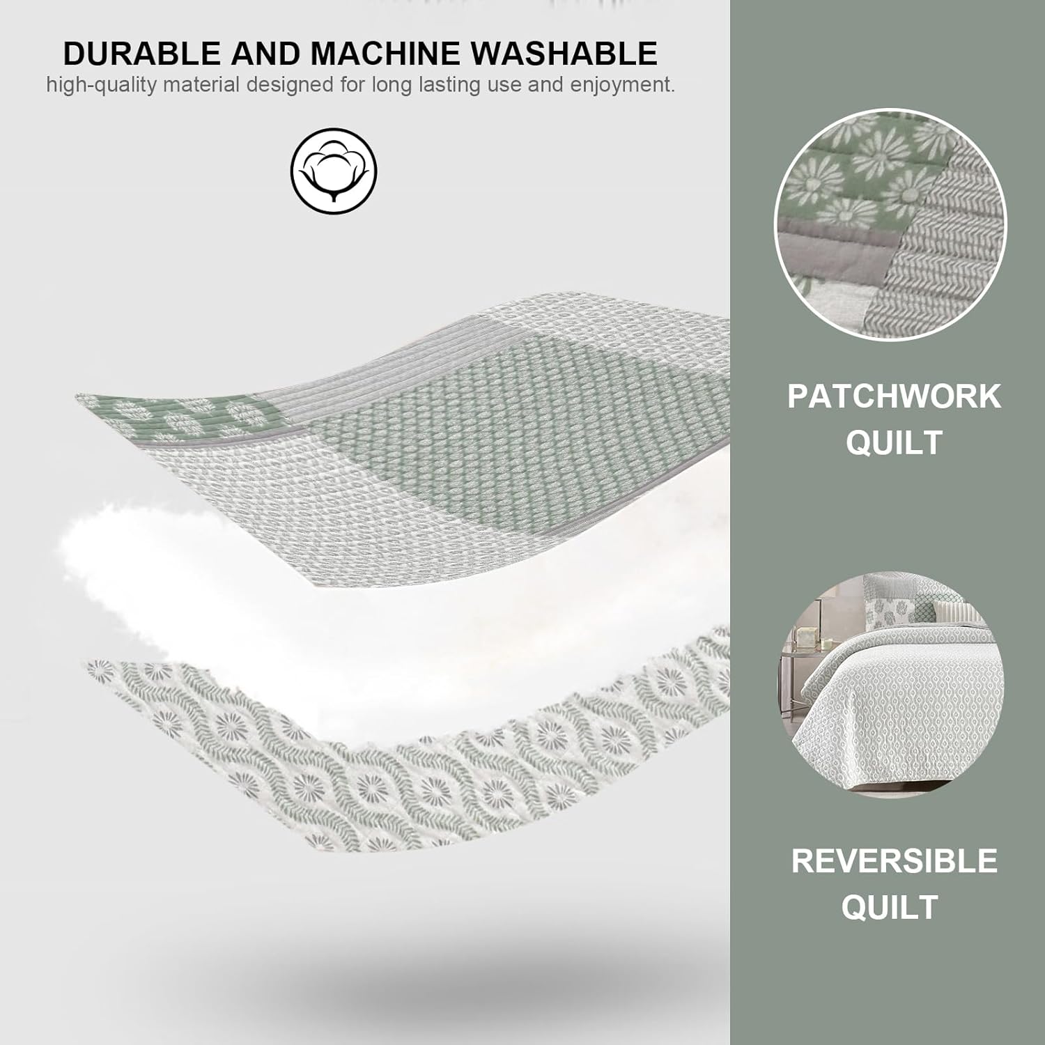 PANGUSHAN Quilt Set King Size, 100% Cotton Bedspread Quilt Bedding Set, Patchwork Reversible Floral Quilt for King Bed, Greyish-Greens Bed Spread, Lightweight Comforter for All Season, 3 Pieces