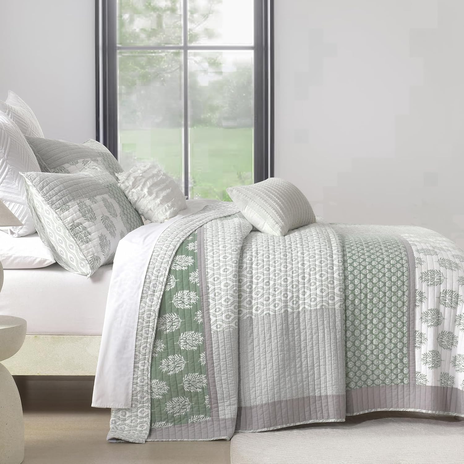 PANGUSHAN Quilt Set Queen Size, 100% Cotton Bedspread Quilt Bedding Set, Patchwork Reversible Floral Quilt for Queen Bed, Greyish-Green Bed Spread, Lightweight Comforter for All Season, 3 Pieces