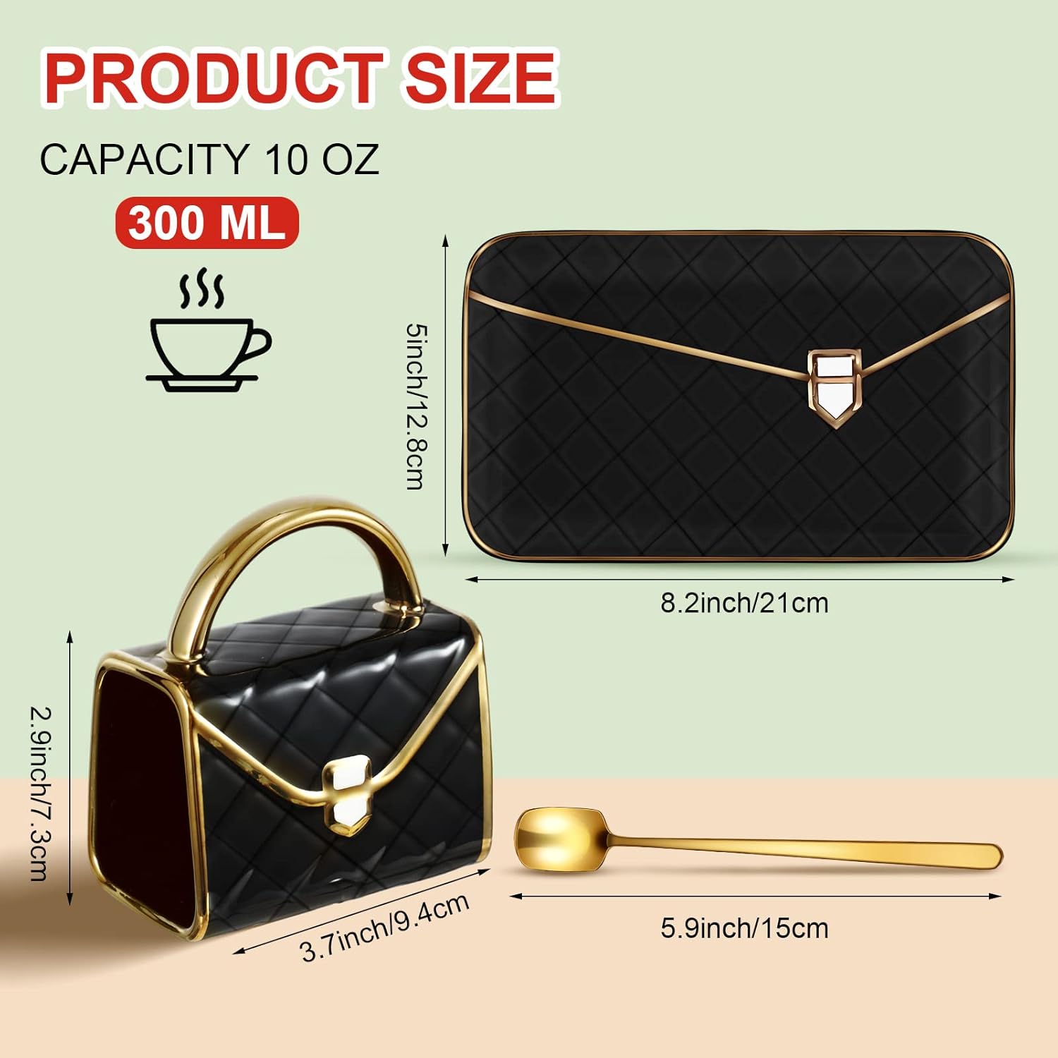 - Proper Capacity: the ceramic handbag mug measures approx. 4.33 x 2.9 x 3.7 inches/ 11 x 7.3 x 9.4 cm and can offer a capacity of about 10 oz/ 300 ml, which can hold a variety of hot and cold drinks; With handles, the coffee cup can bring easy and comfortable grip and hold; The saucer is about 8.2 x 5 inches/ 21 x 12.8 cm and the spoon measure about 5.9 inches/ 15 cm in length