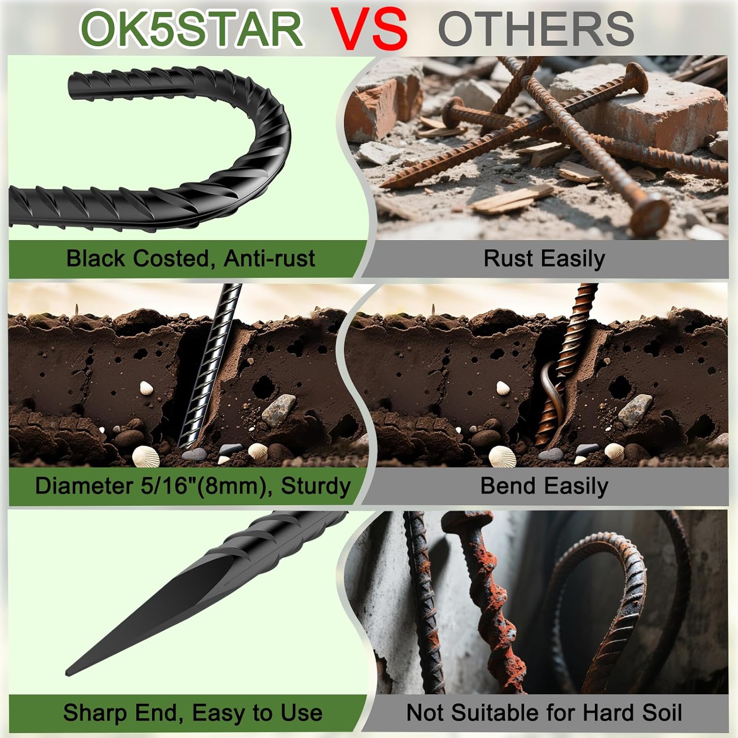 - Anti-Rust: Ground stakes heavy duty are treated with galvanization, the painted surface made them less likely to rust