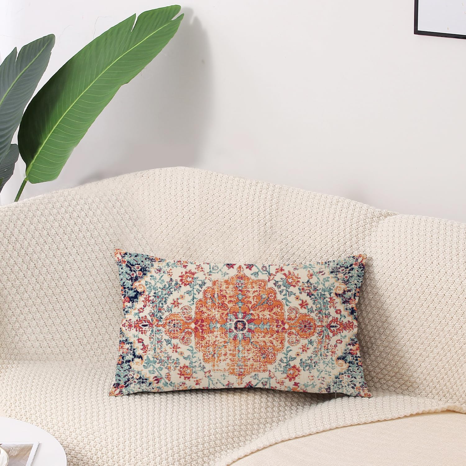 Outdoor Waterproof Pillow Covers - 12X20 Inch Set of 2, Bohemian Vintage Carpet Pattern, Orange Blue Ethnic Design, Decorative Farmhouse for Couch, Garden, Balcony