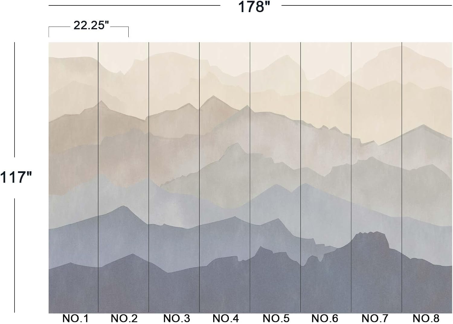 - The size of the wallpaper is 178" wide x 117" high and divided into 8 panels.