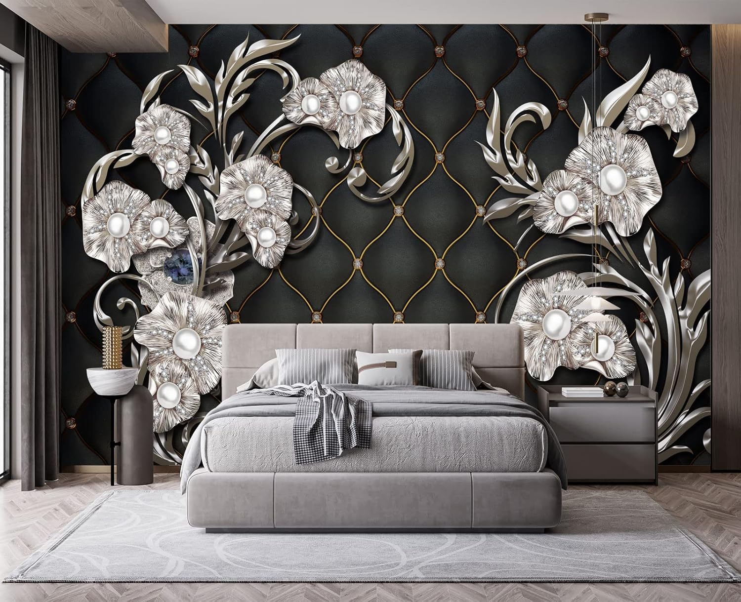 Black Hard Wrapped Pearl Embossed Flowers Wall Mural Wallpaper for Bedroom 137" x 100"