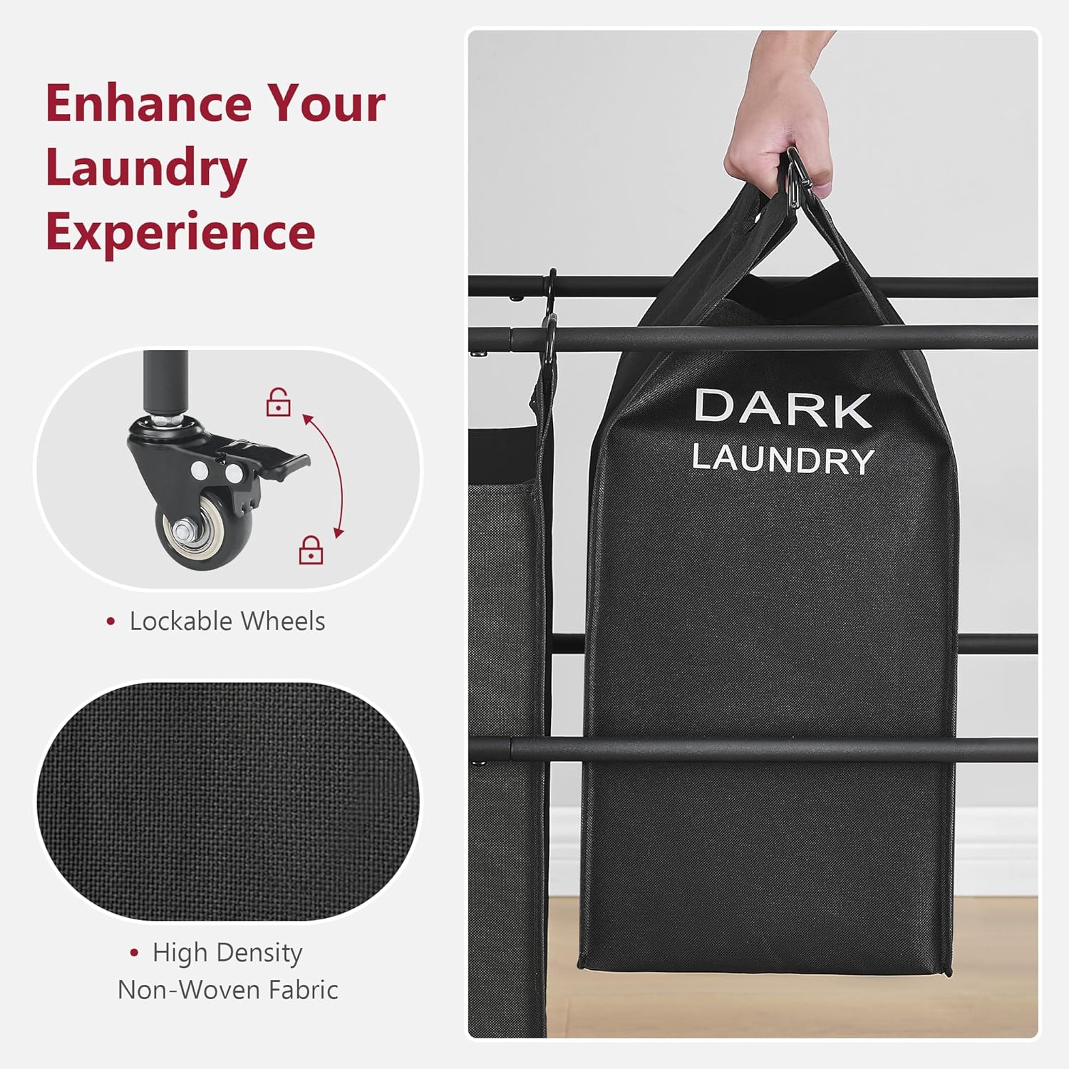 - 【Removable Laundry Bags】Each laundry bag can be taken out individually from the 2-part laundry sorter, use the two metal handles to lift the laundry bag for easy access to the laundry room.