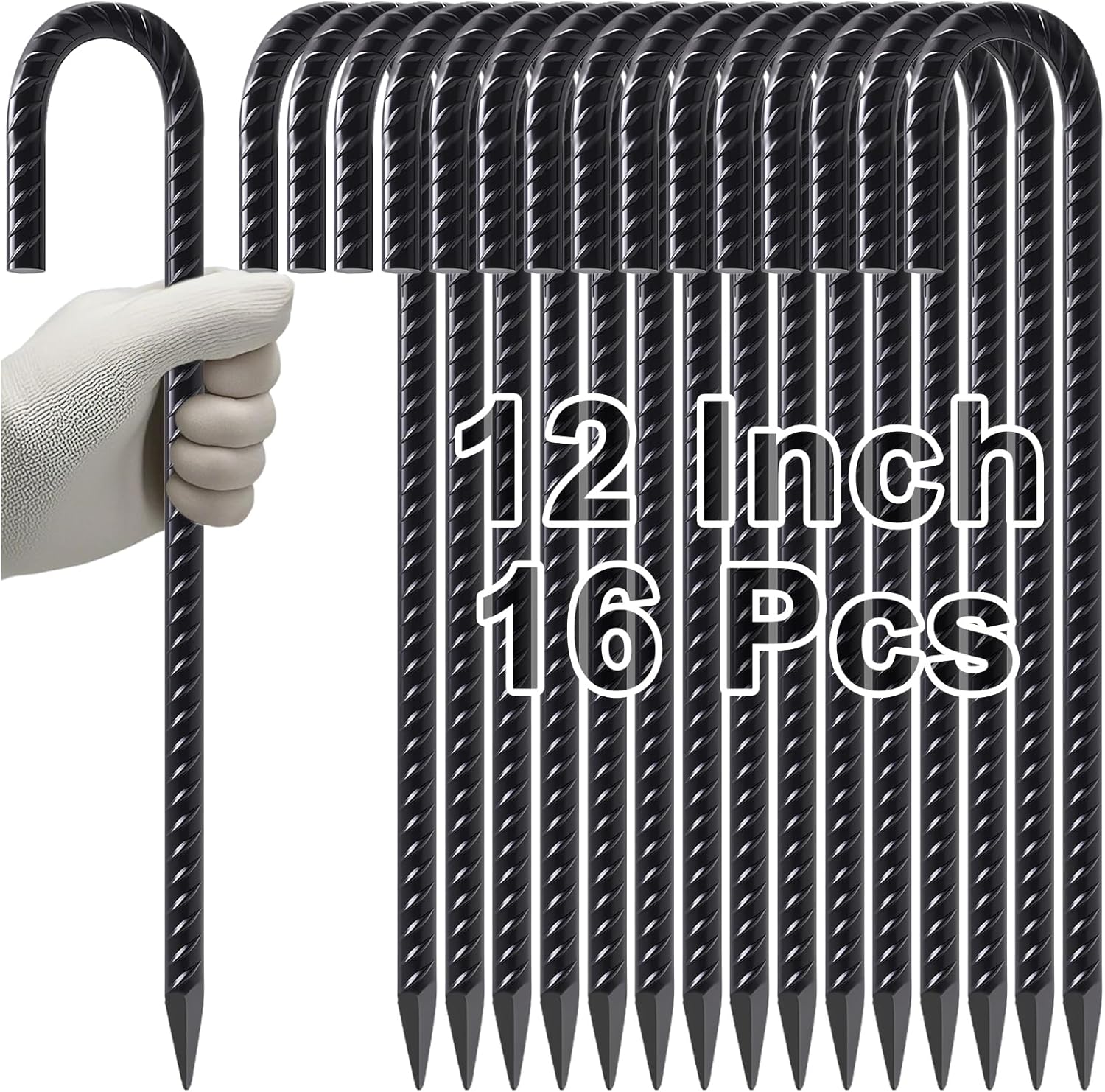 VVOKGO Rebar Stakes 12 Inches J Hook Heavy Duty Chain Link Fence Stakes, 16 Pcs Metal Long Tent Spikes Ground Anchors for Wire Fencing, Dogs Digging, Camping Tents, Swings, Greenhouse, Black