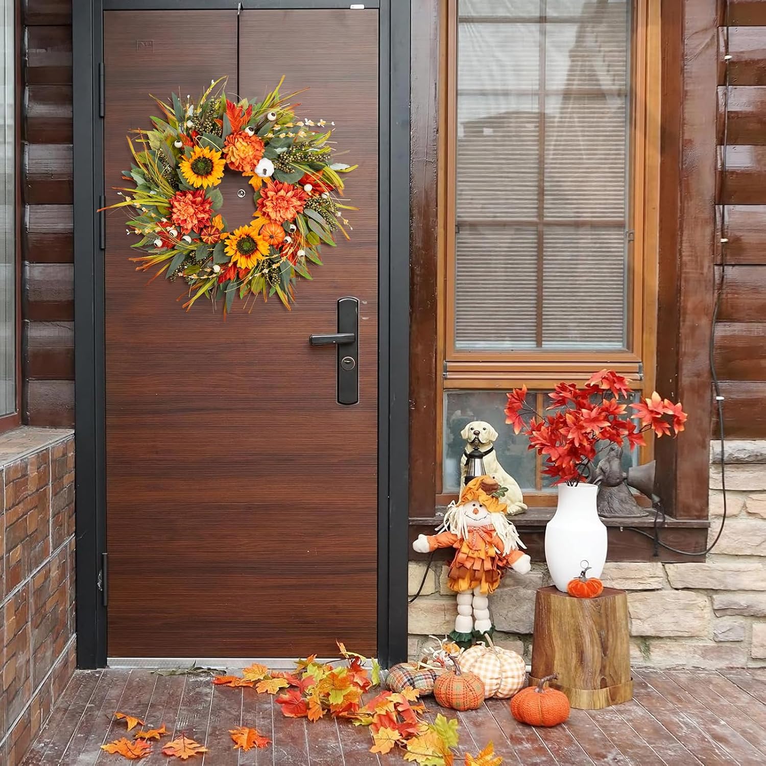 - Ready for Outdoor Display – Rain or Shine Built to last through all of fall’s moods, this outdoor wreath for front door is made from weather-resistant materials that hold up to sun exposure and light rain. Hang it on your porch, patio, or entry gate — it’s designed to look beautiful indoors or out.