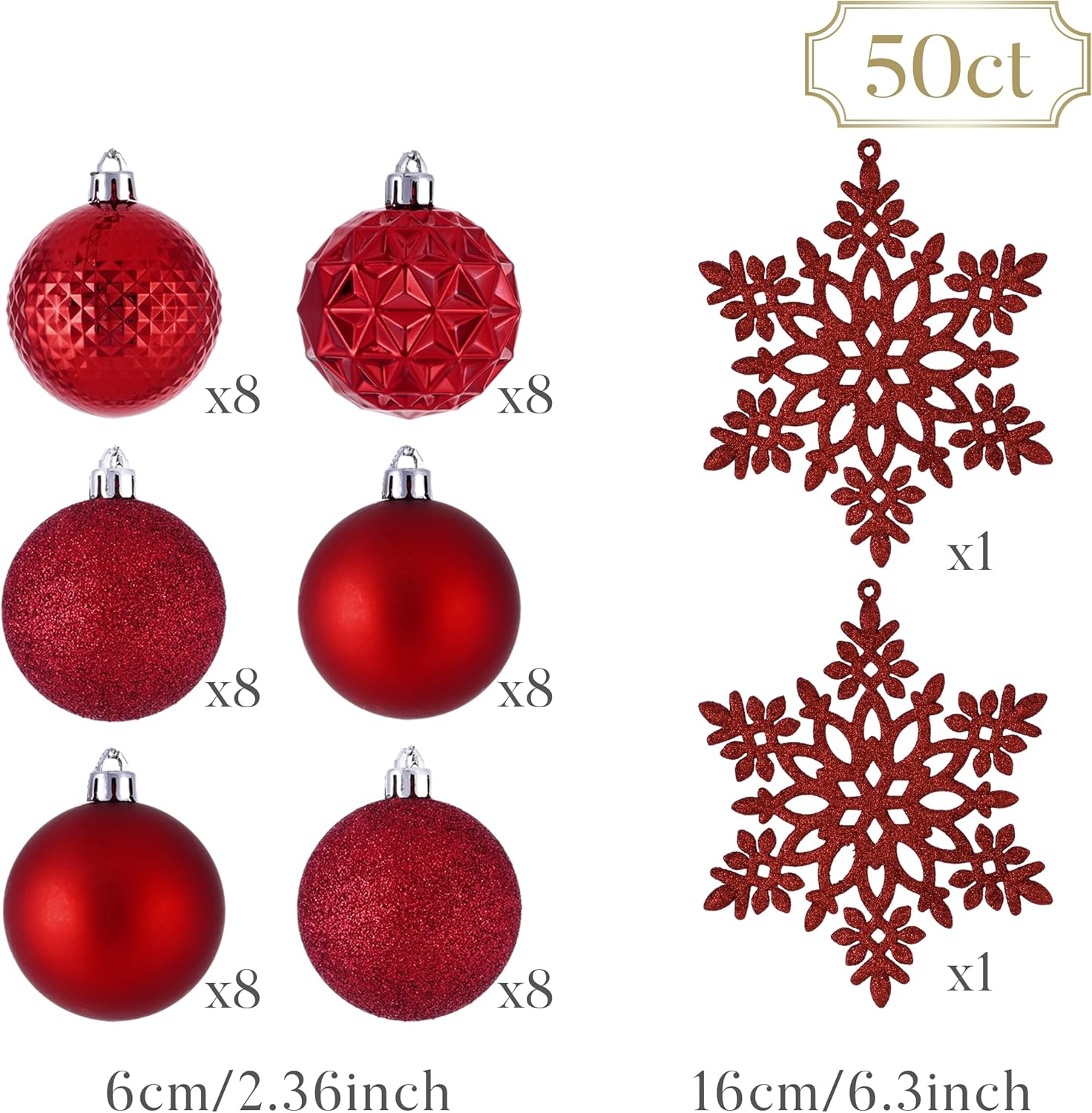 - 【Package and Size】This ornament ball set include 50pcs Christmas ornaments measuring 2.36 inches in diameter, featuring seamless connections for a polished look