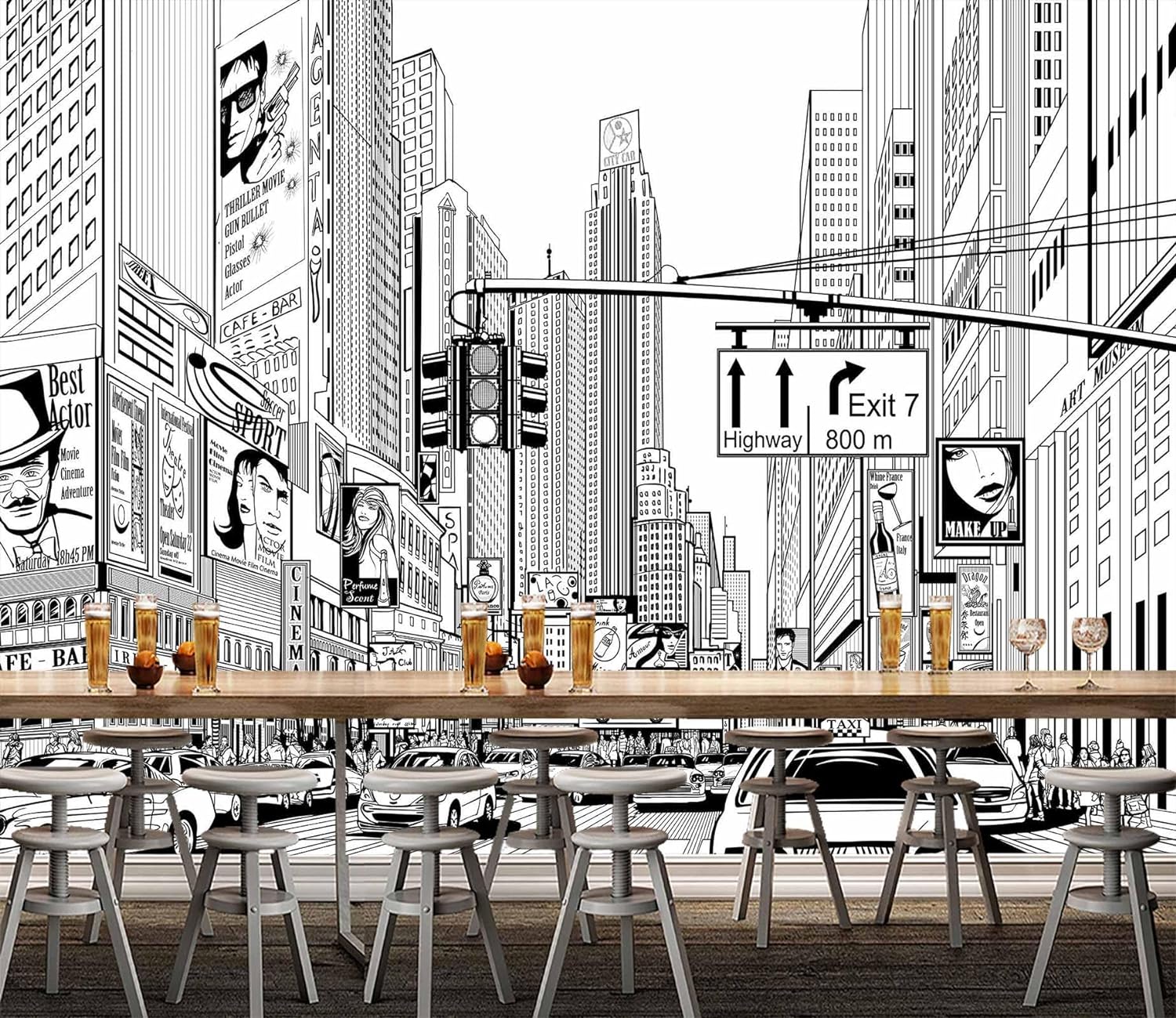 WFBHUA-Black and White New York City Wallpaper Hand Painted Times Square Wall Mural Decoration for Living Room Bedroom Offices(Not Peel and Stick)