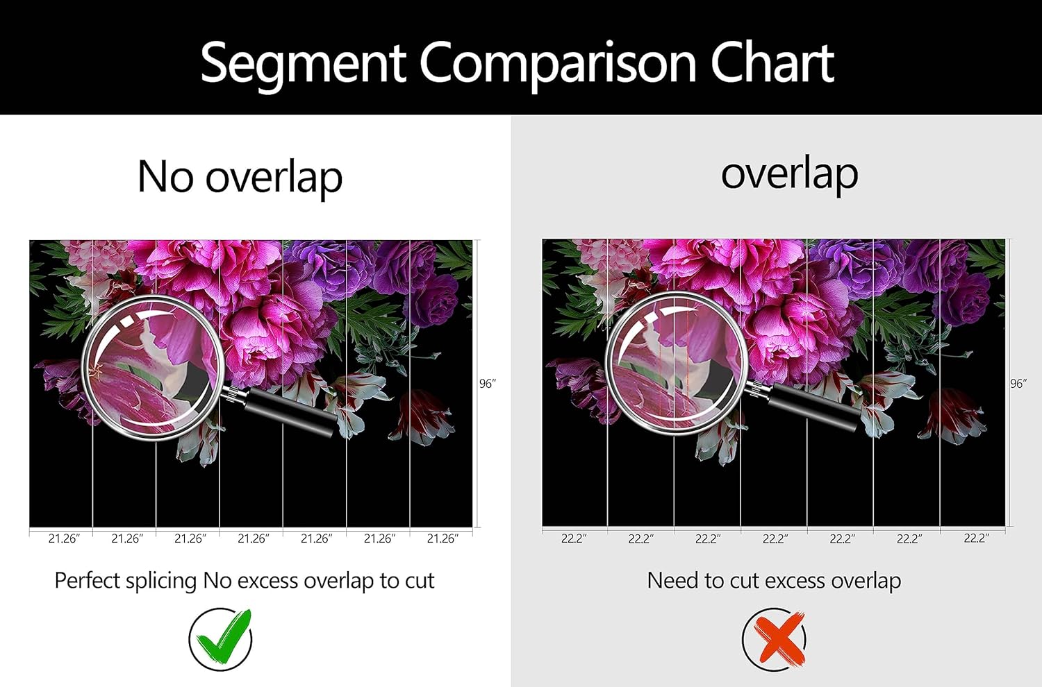 - Mural Size: The total size of this mural wallpaper is 149" x 96" / 378CM x 244CM (W x H), cut into 7 pieces, each measuring 21.26" x 96", for easy installation.