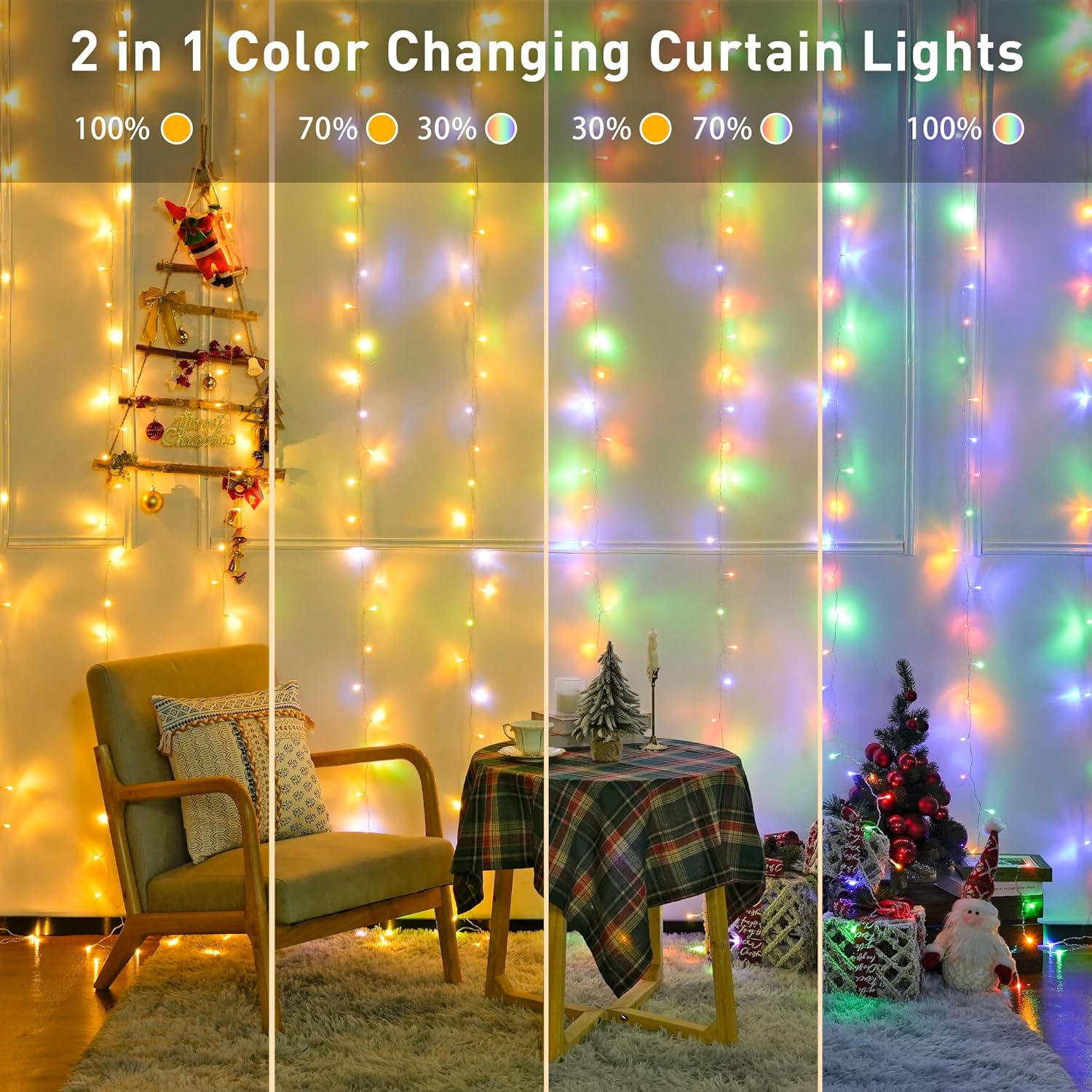 - Connectable String Lights: The 9.8x9.8ft Christmas lights come with 10 light strands, each containing 30 LEDs for a total of 300 LEDs. They can also connect up to three sets of color-changing twinkle curtain lights.