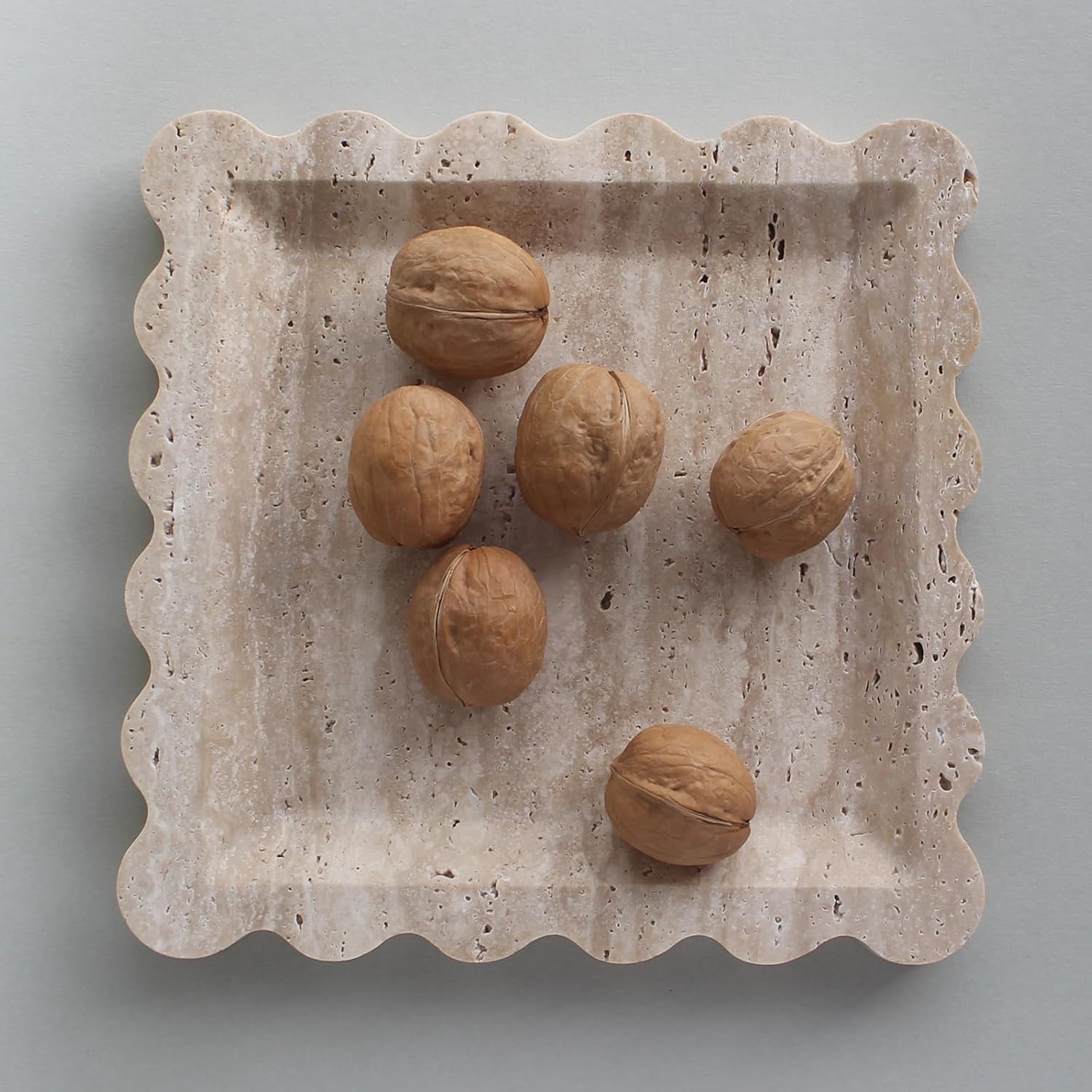 Natural Luxury Marble Tray with Scalloped Edge, Handmade Square Decorative Tray, Catch All Tray for Counter, Dresser, Nightstand and Home Décor (Beige Travertine)