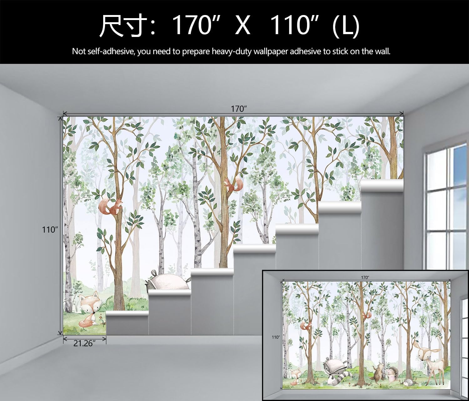 - Mural Size: The total size of this mural wallpaper is 170" x 110" / 432CM x 280CM (W x H), cut into 8 pieces, each measuring 21.26" x 110", for easy installation.
